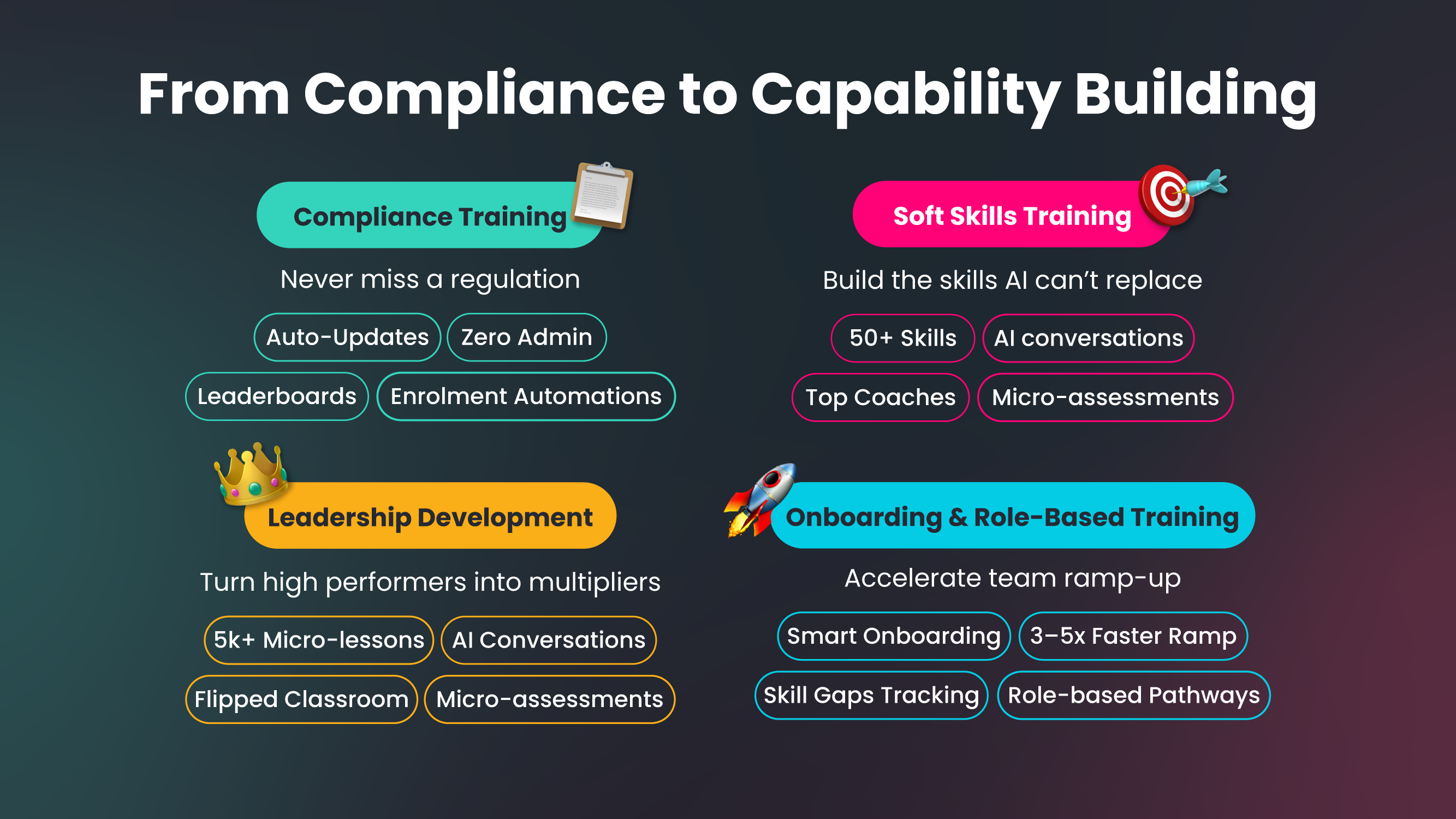Was es wirklich auszeichnet, ist die Anpassungsfähigkeit. Wir können problemlos unsere eigenen Loom-Aufnahmen und Videos hinzufügen und so interne Prozessdokumentationen in strukturierte Schulungsmodule verwandeln. Dadurch wird es mehr als nur eine Lernplattform – es ist zu unserem zentralen Knotenpunkt für Einarbeitung, Weiterbildung und Prozessklarheit geworden.