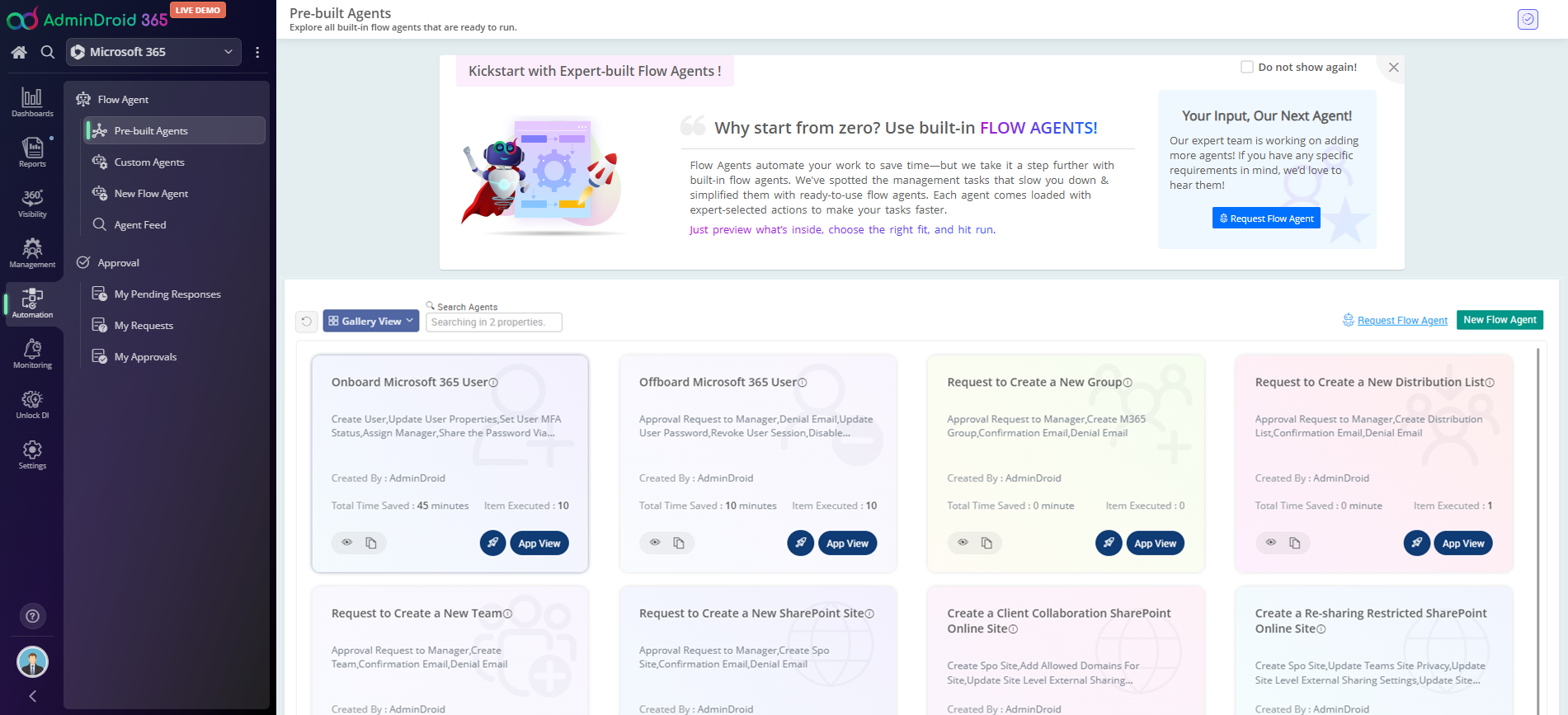 Automatisierung mit Flow Agents - Automatisieren Sie Onboarding, Offboarding und routinemäßige Verwaltungstätigkeiten mit einem zentralisierten, codefreien Workflow-Builder, der von einzelnen Benutzern bis zu Tausenden skaliert.