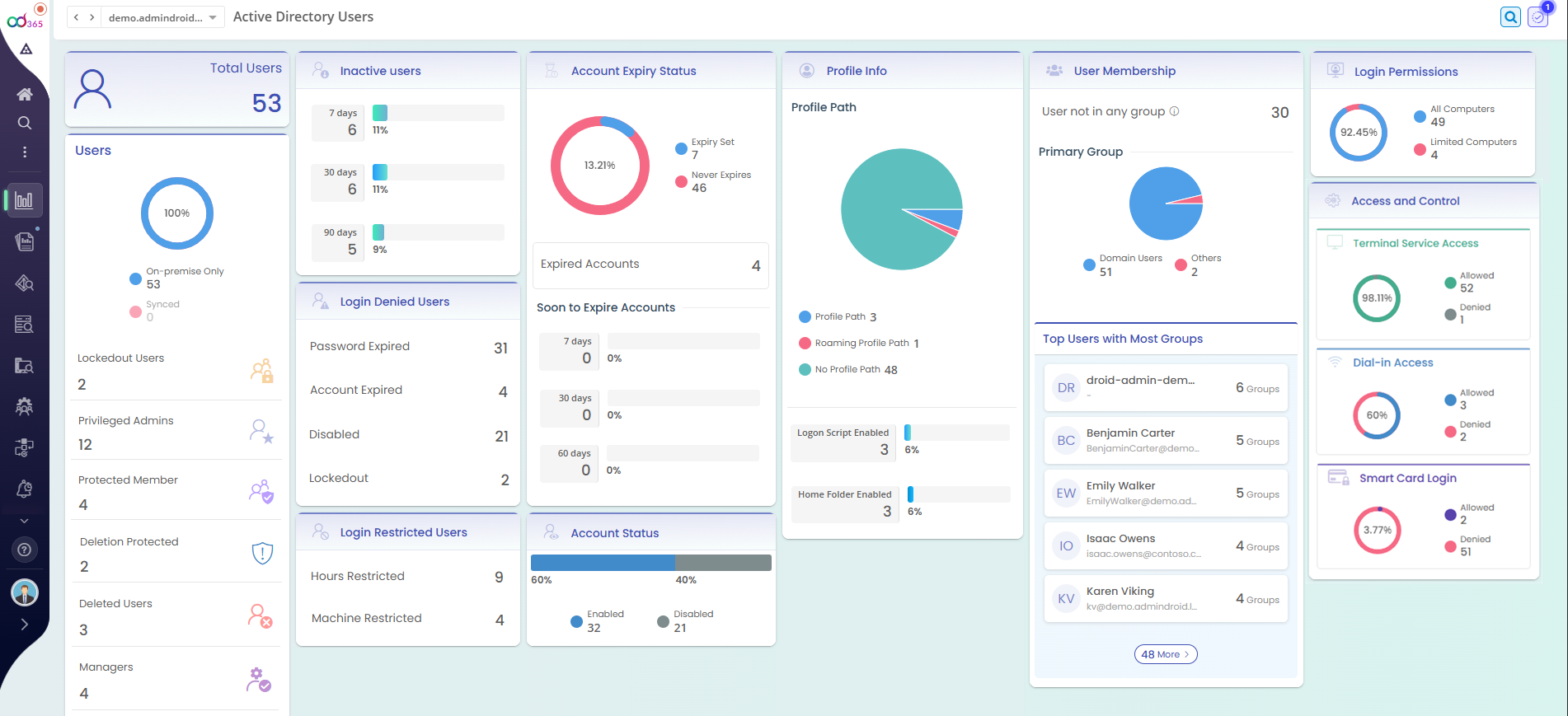 Active Directory-Berichterstellung & -Prüfung - Detaillierte AD-Berichte über Benutzer, Gruppen, Computer, OUs, GPOs, Anmeldungen und Sicherheitsereignisse, die tiefgehende Einblicke in Verzeichnisaktivitäten und sicherheitsrelevante Änderungen bieten.