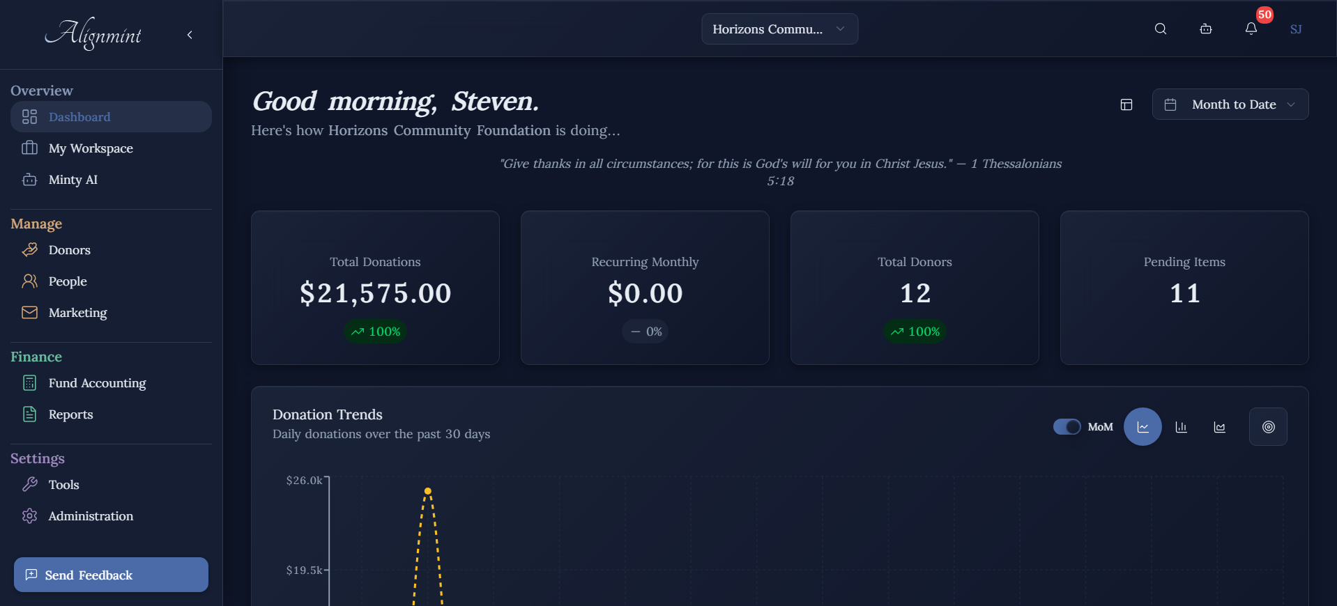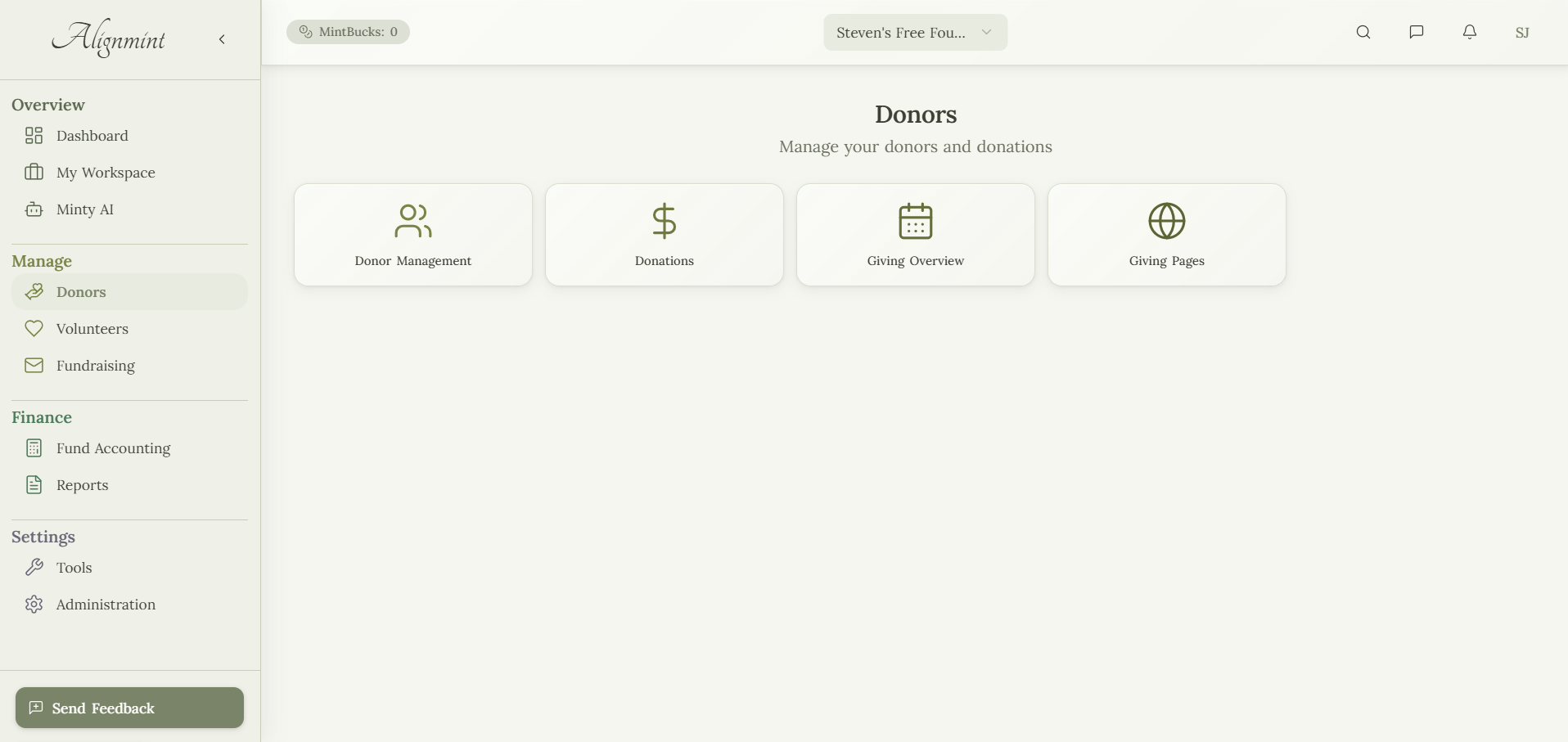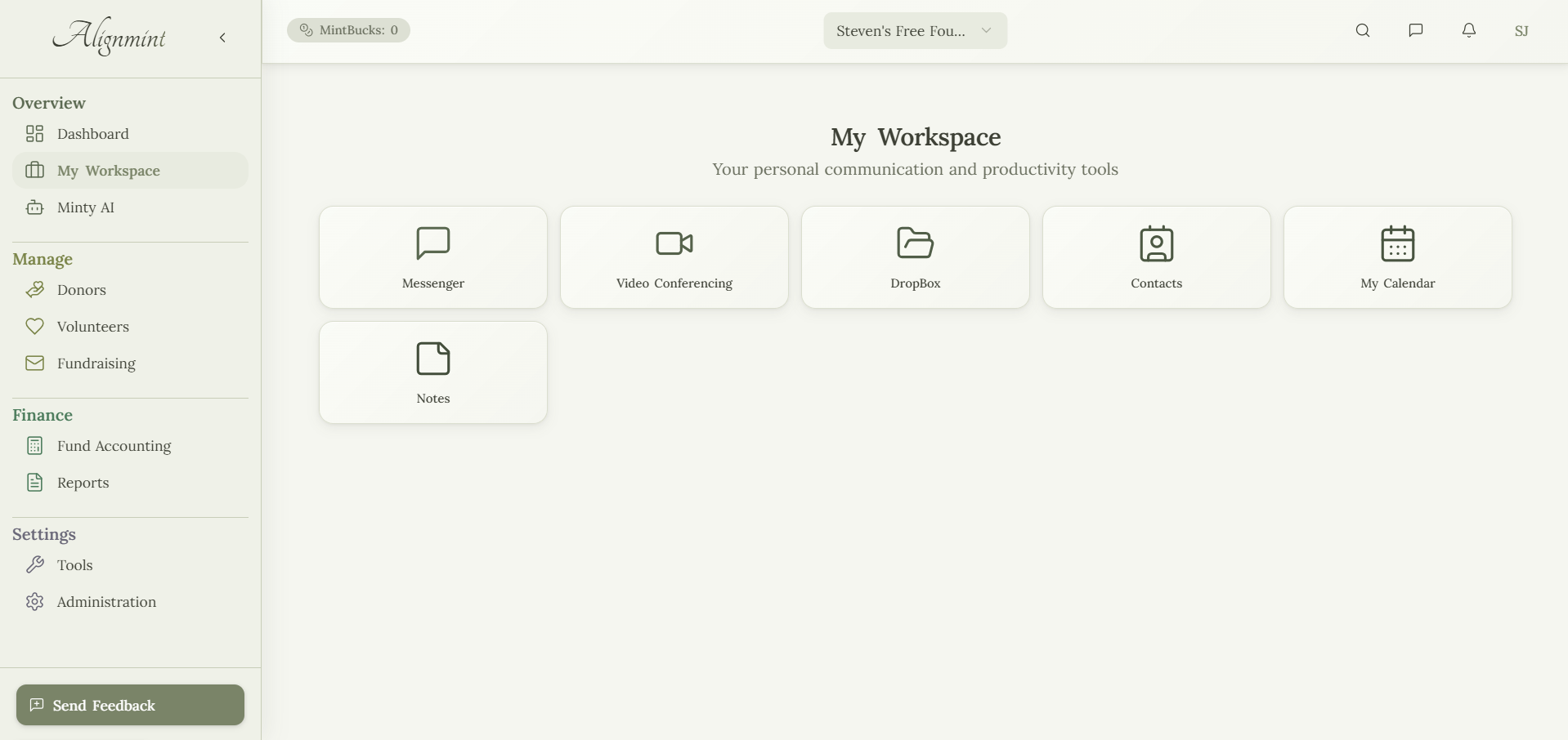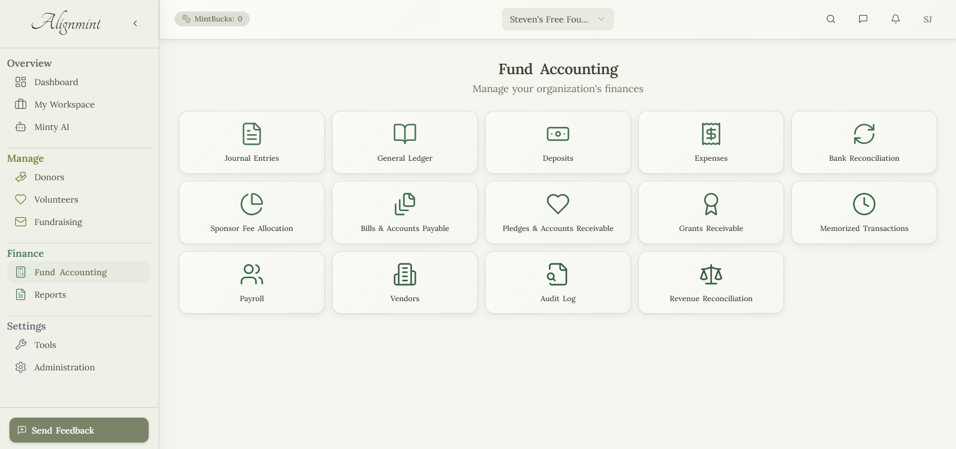 Die Plattform umfasst Minty AI, einen KI-Assistenten, der es Benutzern ermöglicht, ihre finanziellen und operativen Daten in natürlicher Sprache abzufragen. Alignmint ist speziell für 501(c)(3)-Organisationen konzipiert und enthält spezialisierte Funktionen für finanzielle Sponsoren, einschließlich einer Multi-Tenant-Architektur, die die Datenisolierung zwischen gesponserten Organisationen unterstützt, konsolidierte Berichterstattung und automatisierte Sponsorengebührenzuweisung.