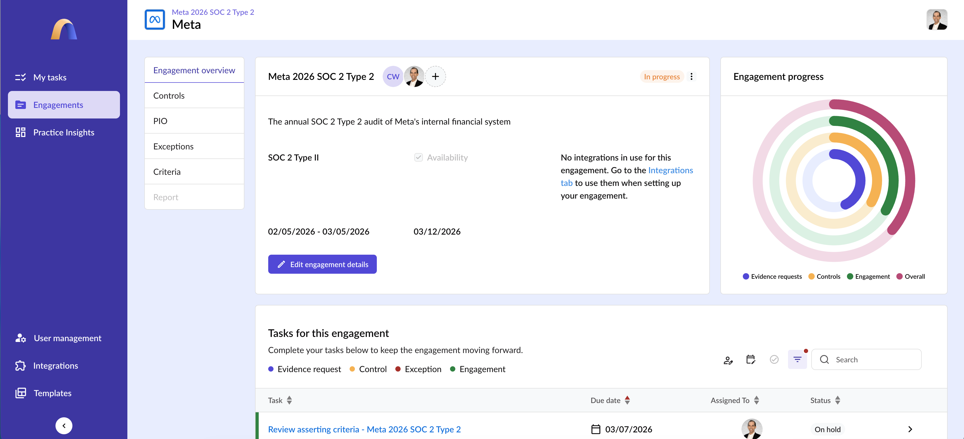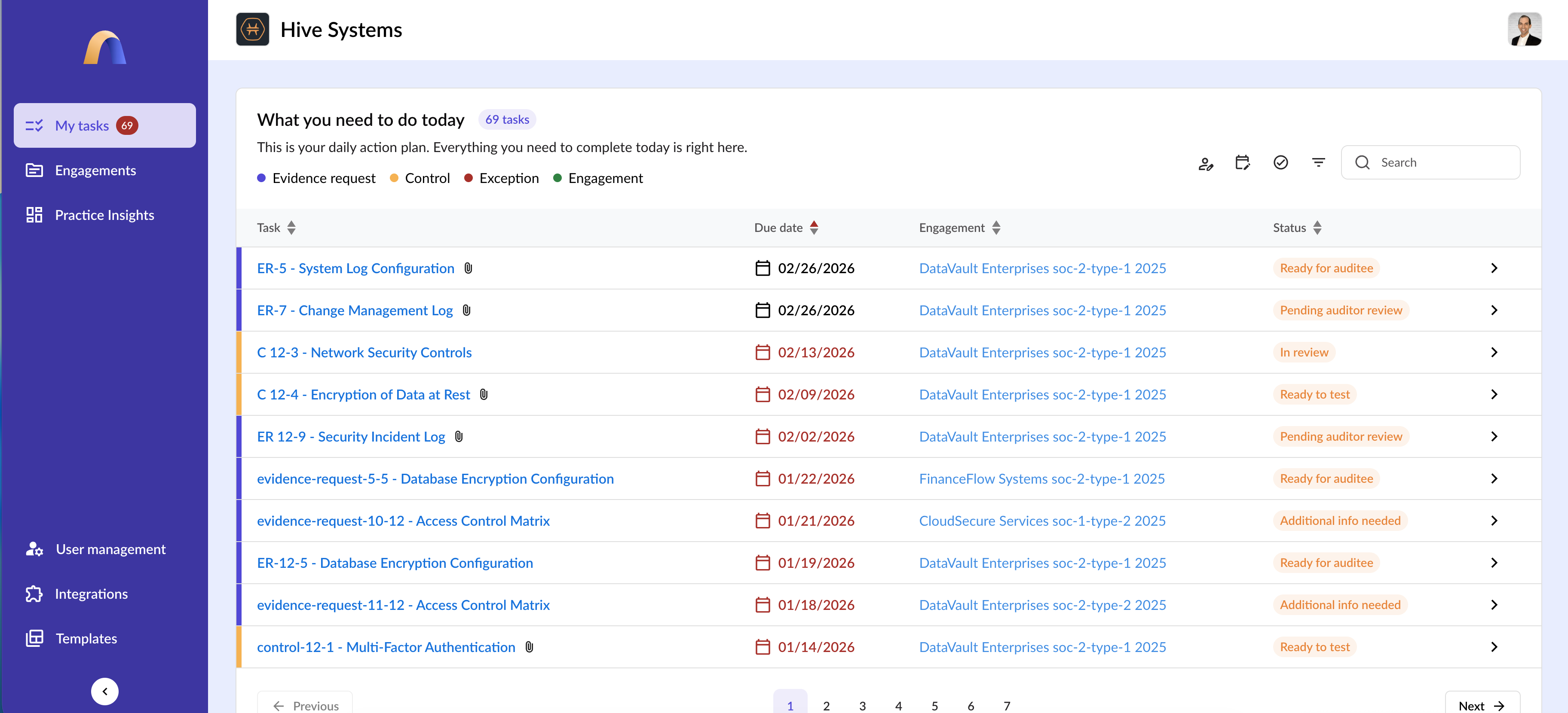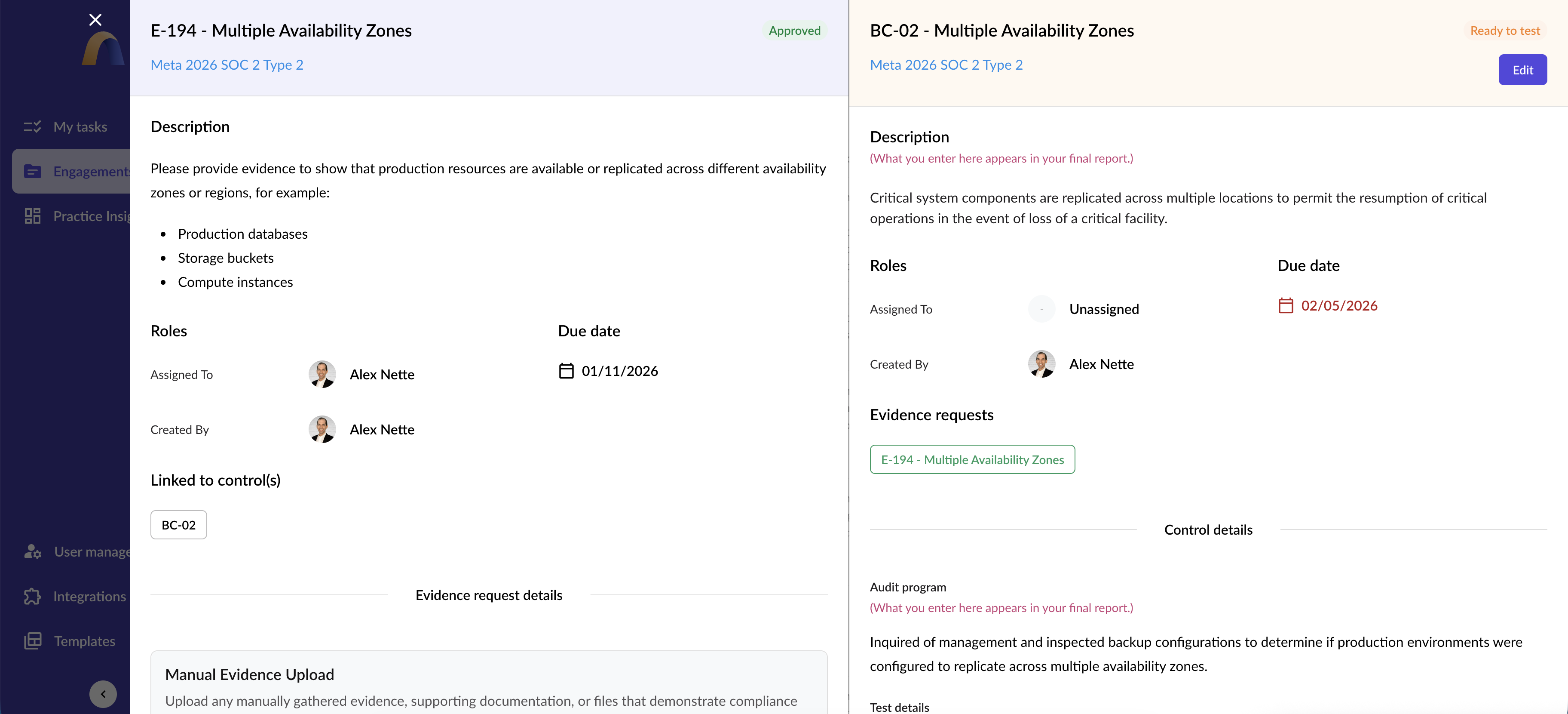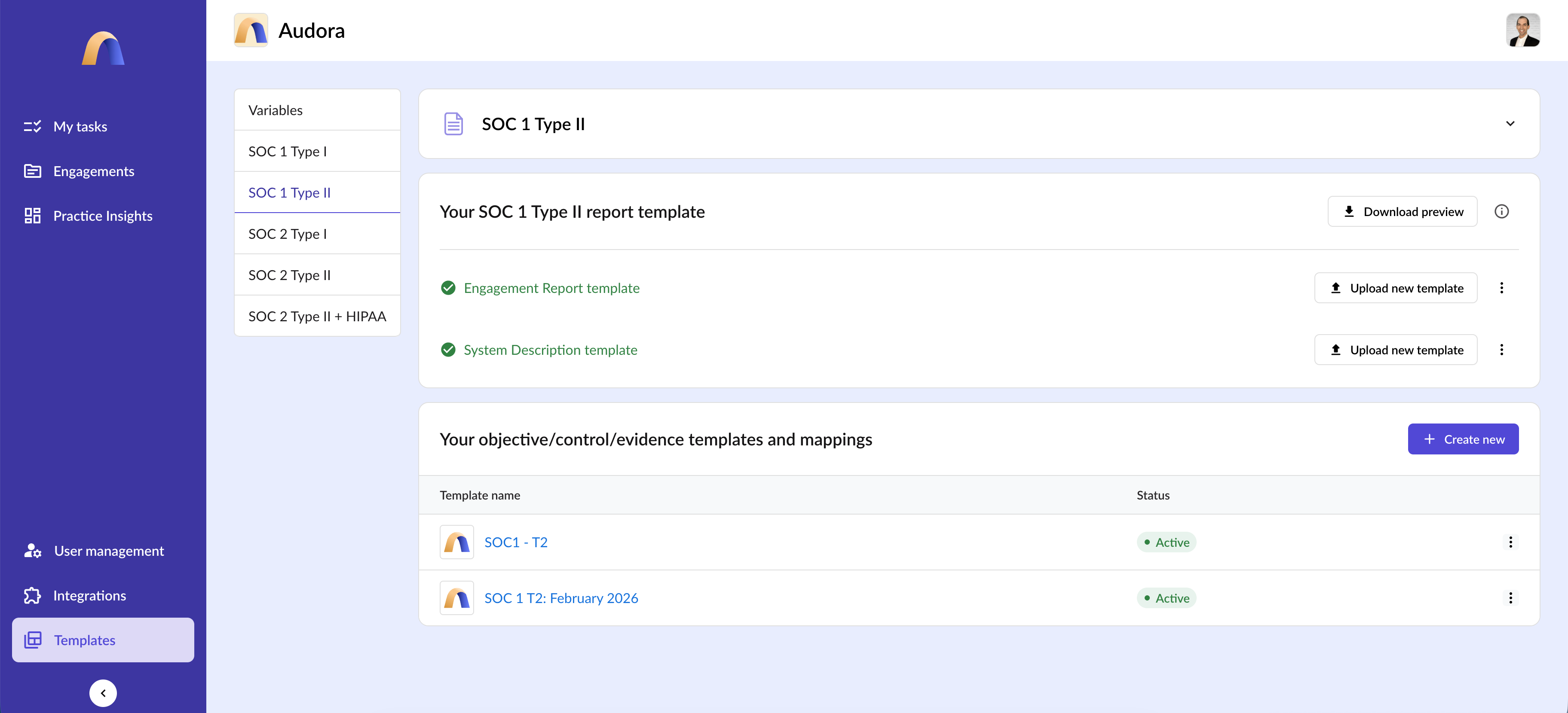 Egal, ob Ihre Firma SOC 1, SOC 2, HIPAA oder andere regulatorische und Compliance-Prüfungen durchführt, Ihr Audora bietet eine strukturierte, aber flexible Grundlage, um mehrere Rahmenwerke und Engagementtypen in einer Umgebung zu verwalten. Von Typ-I- bis Typ-II-Berichten und darüber hinaus passt sich Ihr Audora Ihrer Methodik an und unterstützt dabei Konsistenz und Skalierbarkeit.