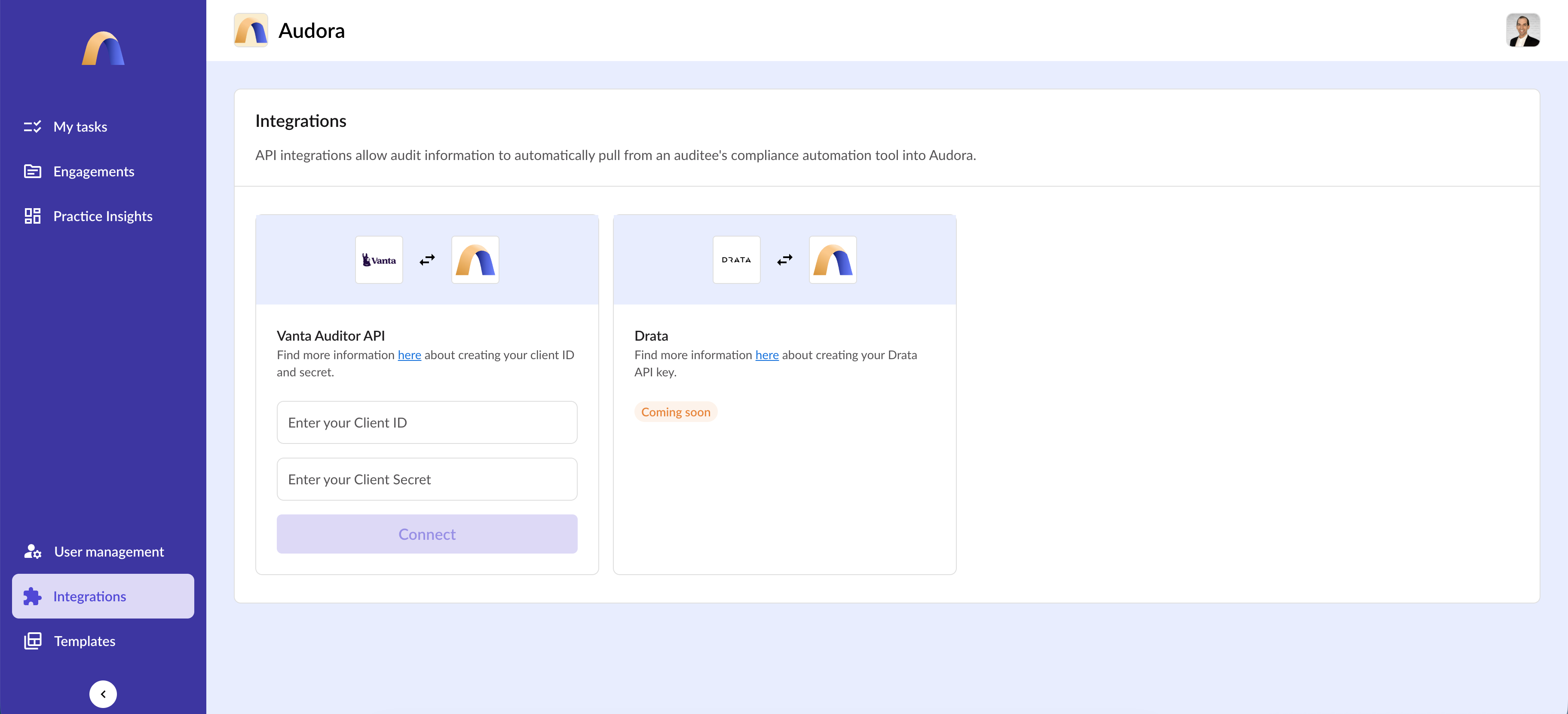 Als webbasierte Auditmanagement-Lösung ersetzt Audora Tabellenkalkulationen, E-Mail-Threads, gemeinsame Laufwerke und manuelle Berichtserstellung durch ein einziges System der Aufzeichnung. Ihr Audora wird zum operativen Zentrum für Ihre Prüfungen und führt sowohl Ihr Team als auch Ihre Kunden durch jede Phase des Audit-Lebenszyklus mit Sichtbarkeit und Verantwortlichkeit.