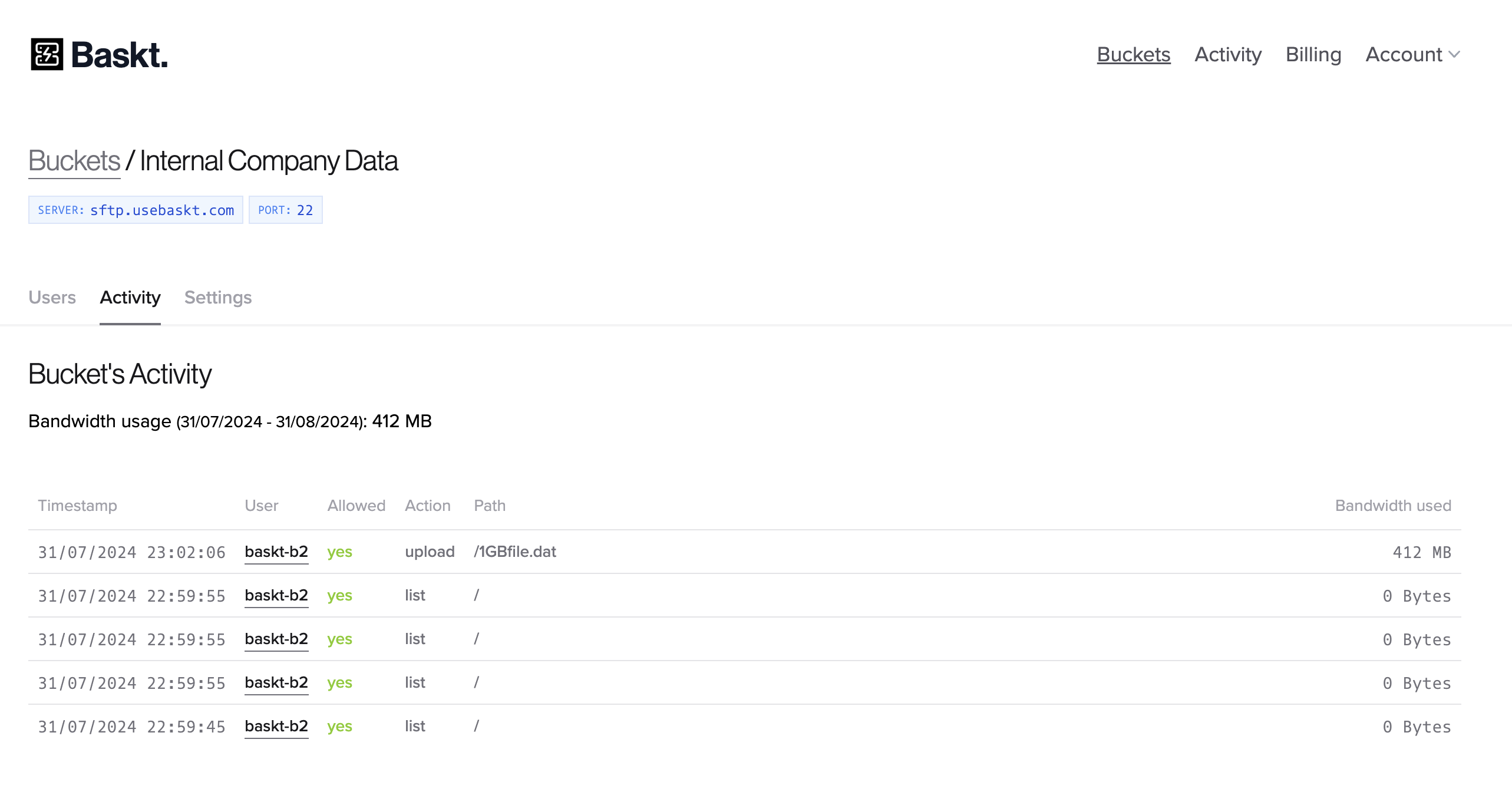 SFTP To Go ist ein vollständig verwalteter Cloud-SFTP-Dienst, den Sie mit einem einzigen Klick einrichten können. Zusätzlich zum SFTP-Protokoll können Sie auch die FTPS- oder Amazon S3-Protokolle verwenden, um auf Ihre Dateien zuzugreifen, und Sie können die Datei- und Datenverarbeitung mithilfe von Webhook-Benachrichtigungen einfach automatisieren.