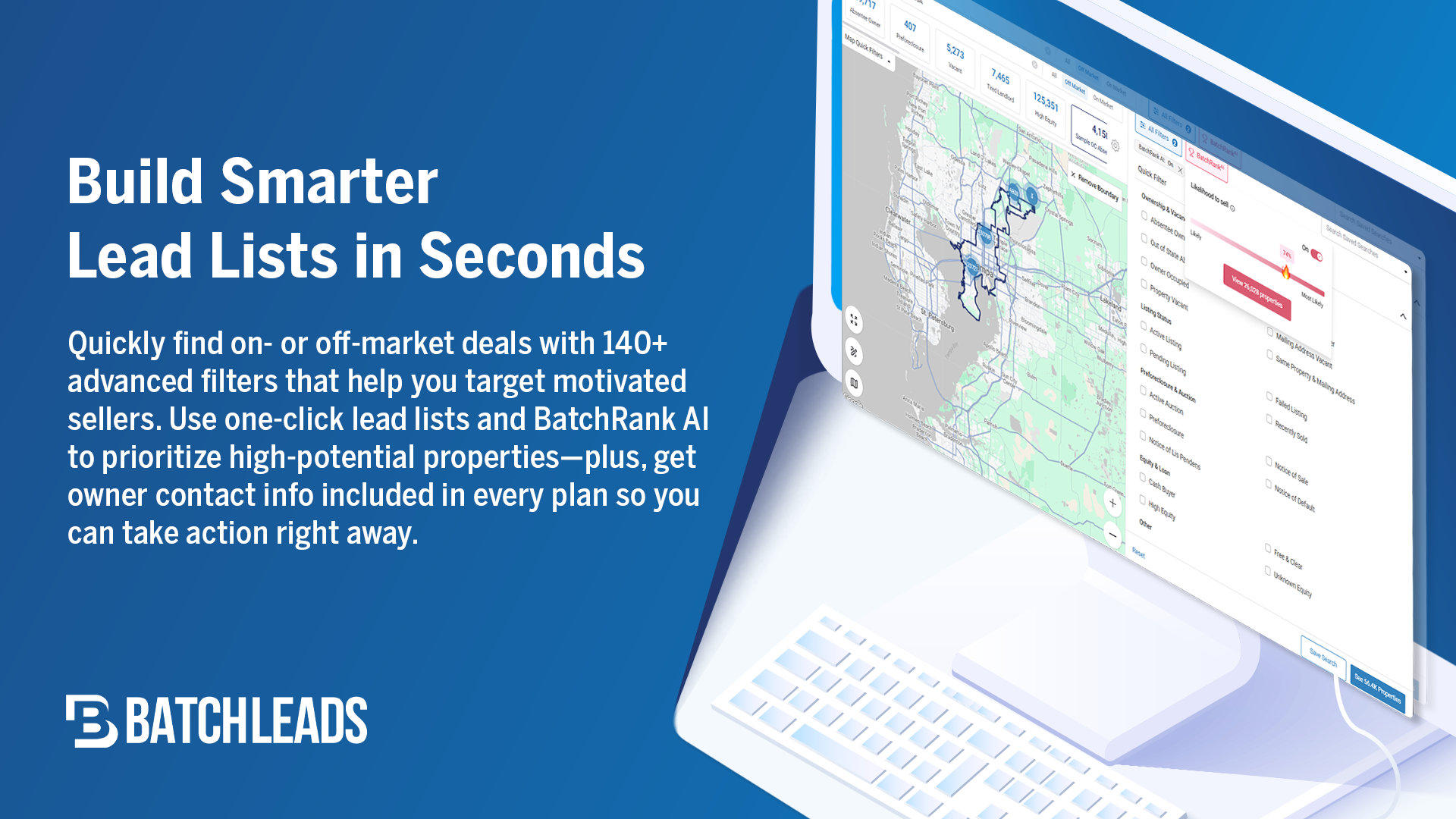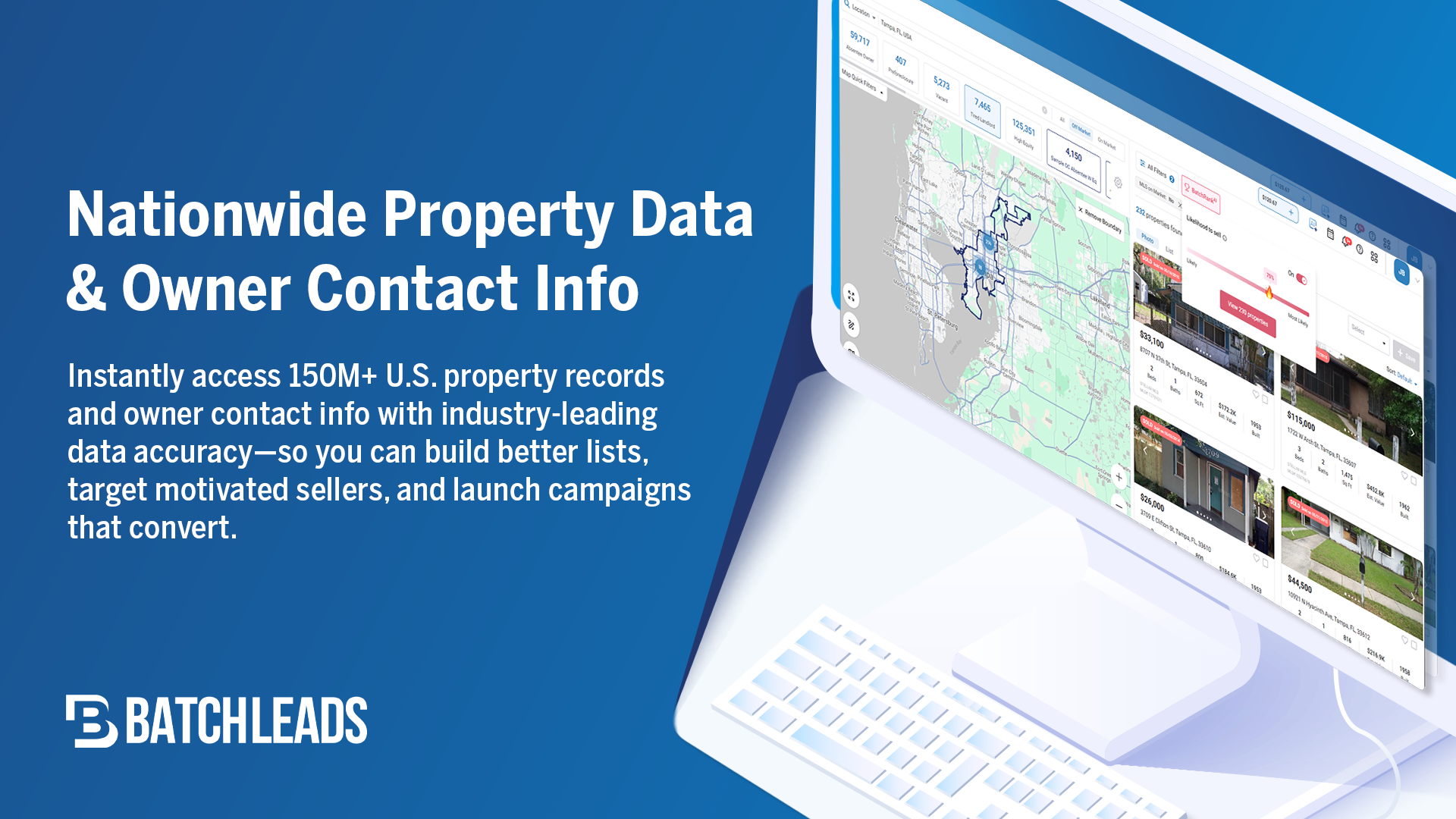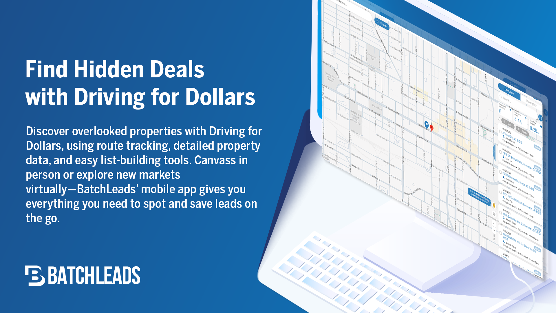 BatchLeads ist die umfassendste Plattform für Immobilienintelligenz, die von Immobilienprofis, Kreditgebern und Anbietern von Immobiliendienstleistungen genutzt wird, um Leads zu generieren, Listen zu verwalten, Off-Market-Deals zu finden und mit Immobilieneigentümern an einem Ort zu interagieren.
