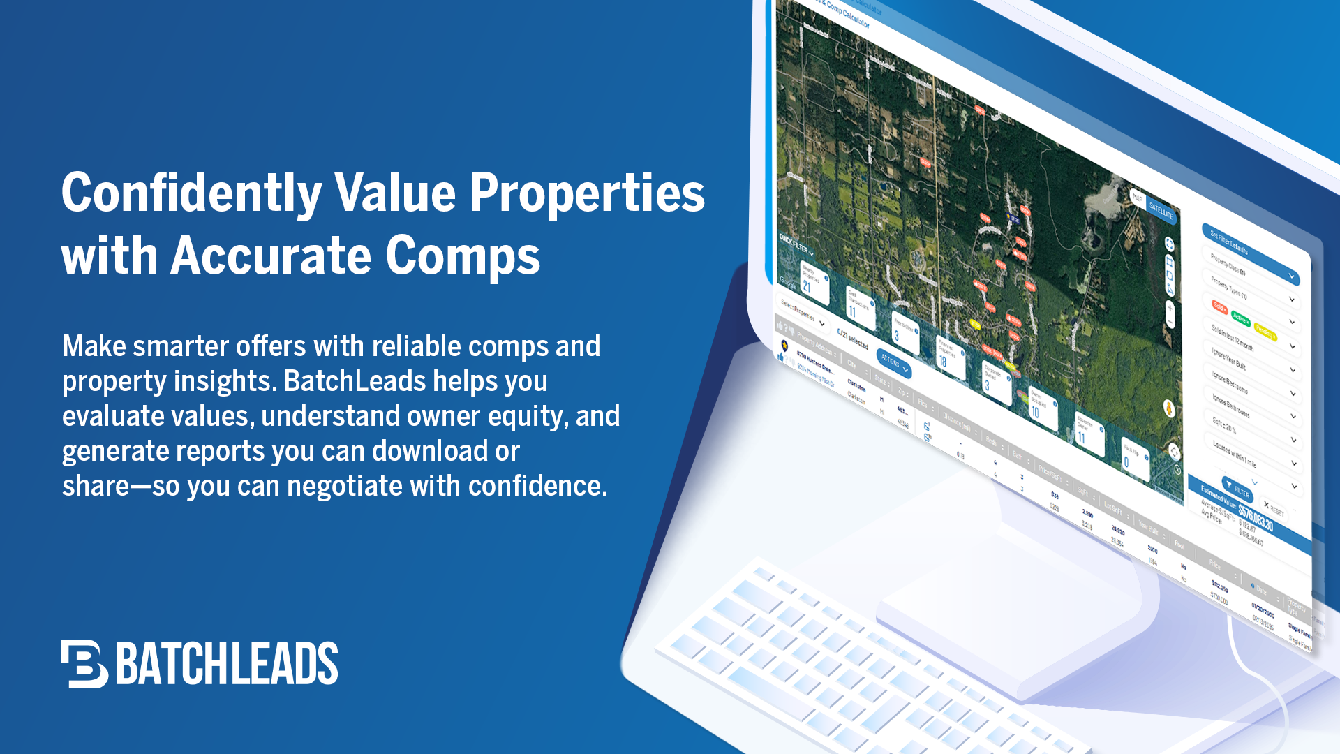 Im Gegensatz zu anderen Immobiliensuchwerkzeugen enden die Suchfilter von BatchLeads nicht bei den Eigenschaften der Immobilie. Verfeinern Sie Ihre Suche mit Haushaltsdemografien, Hypothekeninformationen, MLS und wichtigen Lebensereignissen wie Scheidung, die auf Verkaufsbereitschaft, Kreditbereitschaft oder den Bedarf an spezifischen Wohnungsdienstleistungen hinweisen. Eingebaute Vergleichswerkzeuge, Rechner und exportierbare Berichte helfen Ihnen, Angebote zu machen und Risiken schnell einzuschätzen.