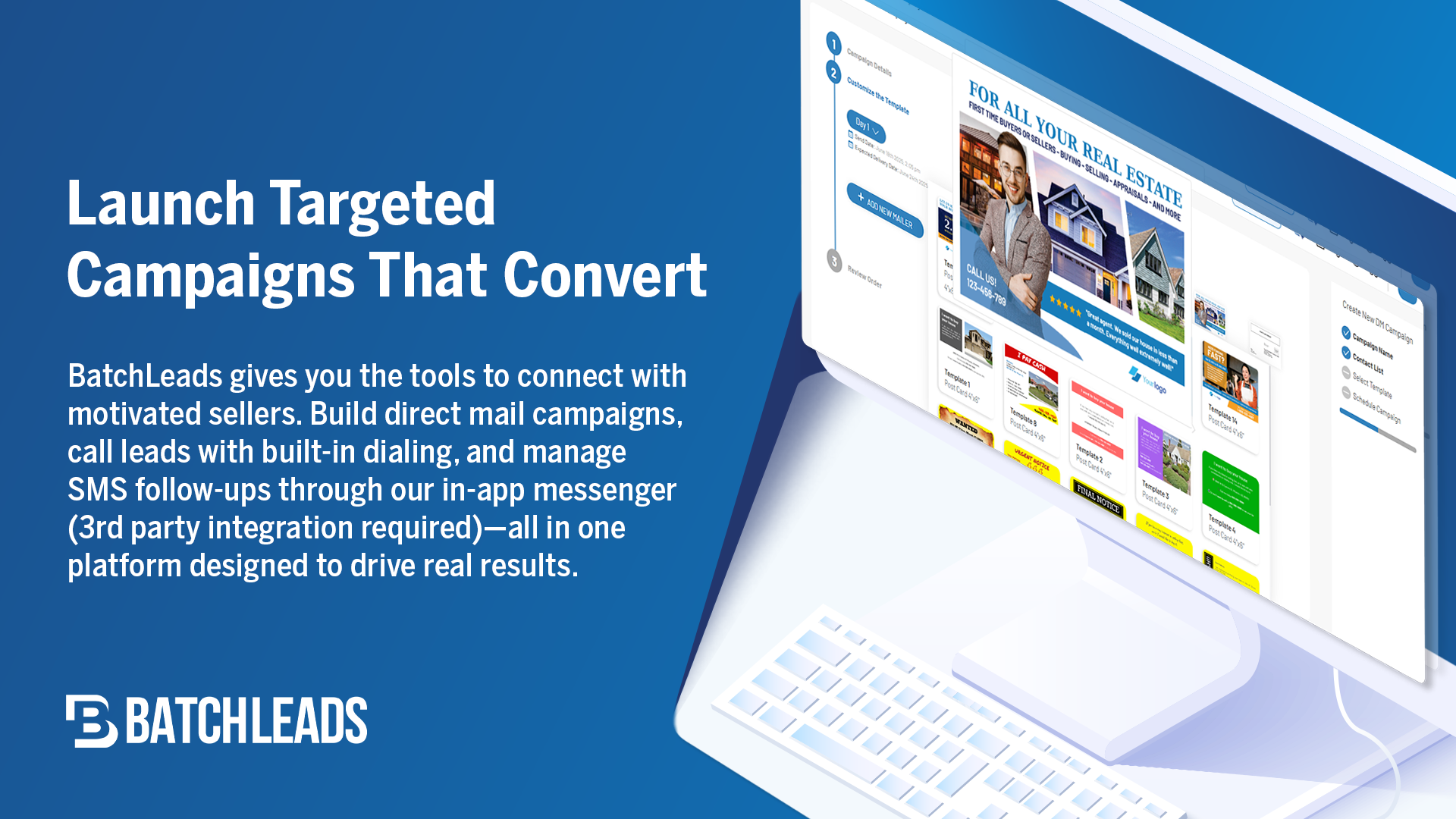 BatchLeads SMS- und Direktmail-Kampagnen helfen Ihnen, Gespräche zu beginnen und die Markenbekanntheit effizient zu skalieren, mit allen Daten, die benötigt werden, um hyper-targetierte und hyper-personalisierte Aktionen in großem Maßstab durchzuführen. Oder exportieren Sie gespeicherte Immobilien und Kontaktinformationen in Ihr CRM oder Drittanbieter-Tools über Out-of-the-Box-Integrationen und APIs.