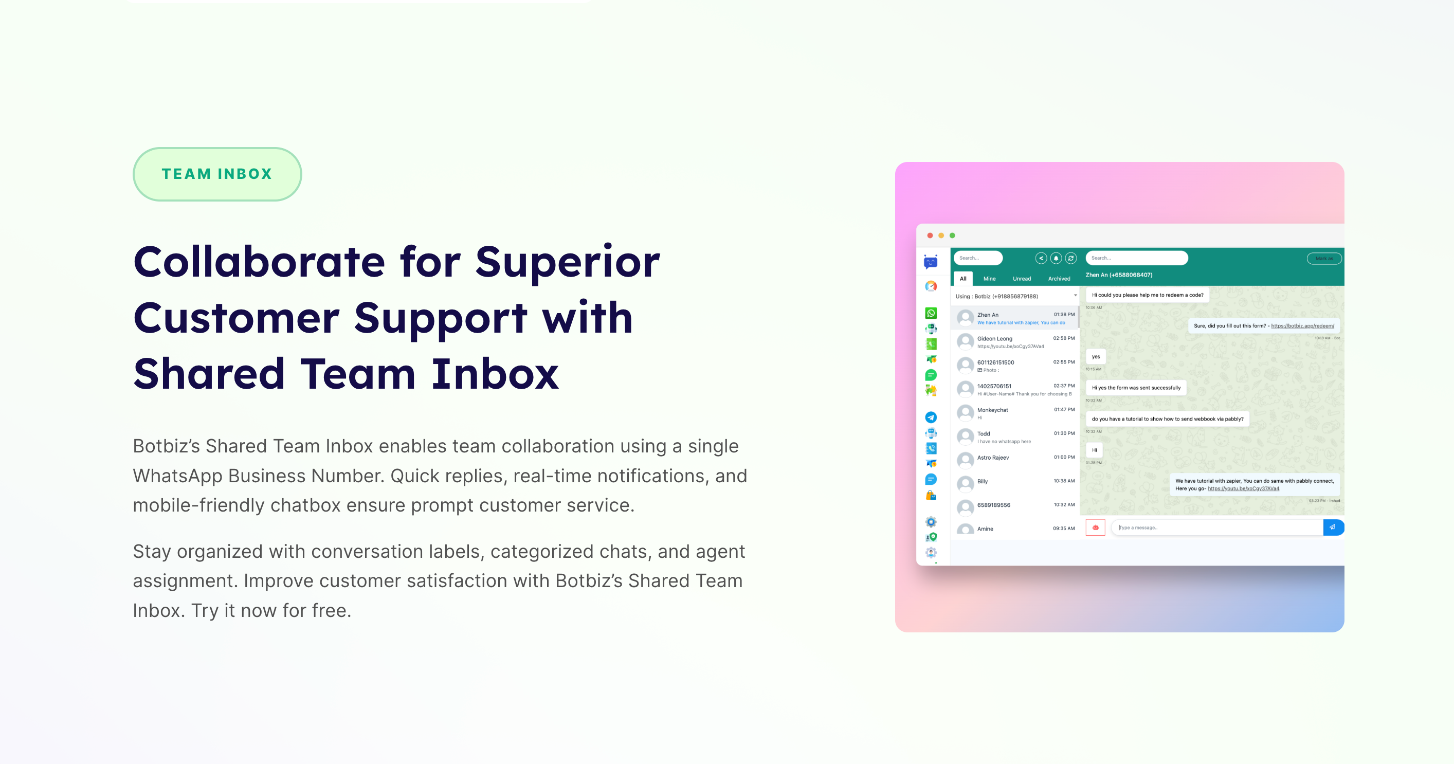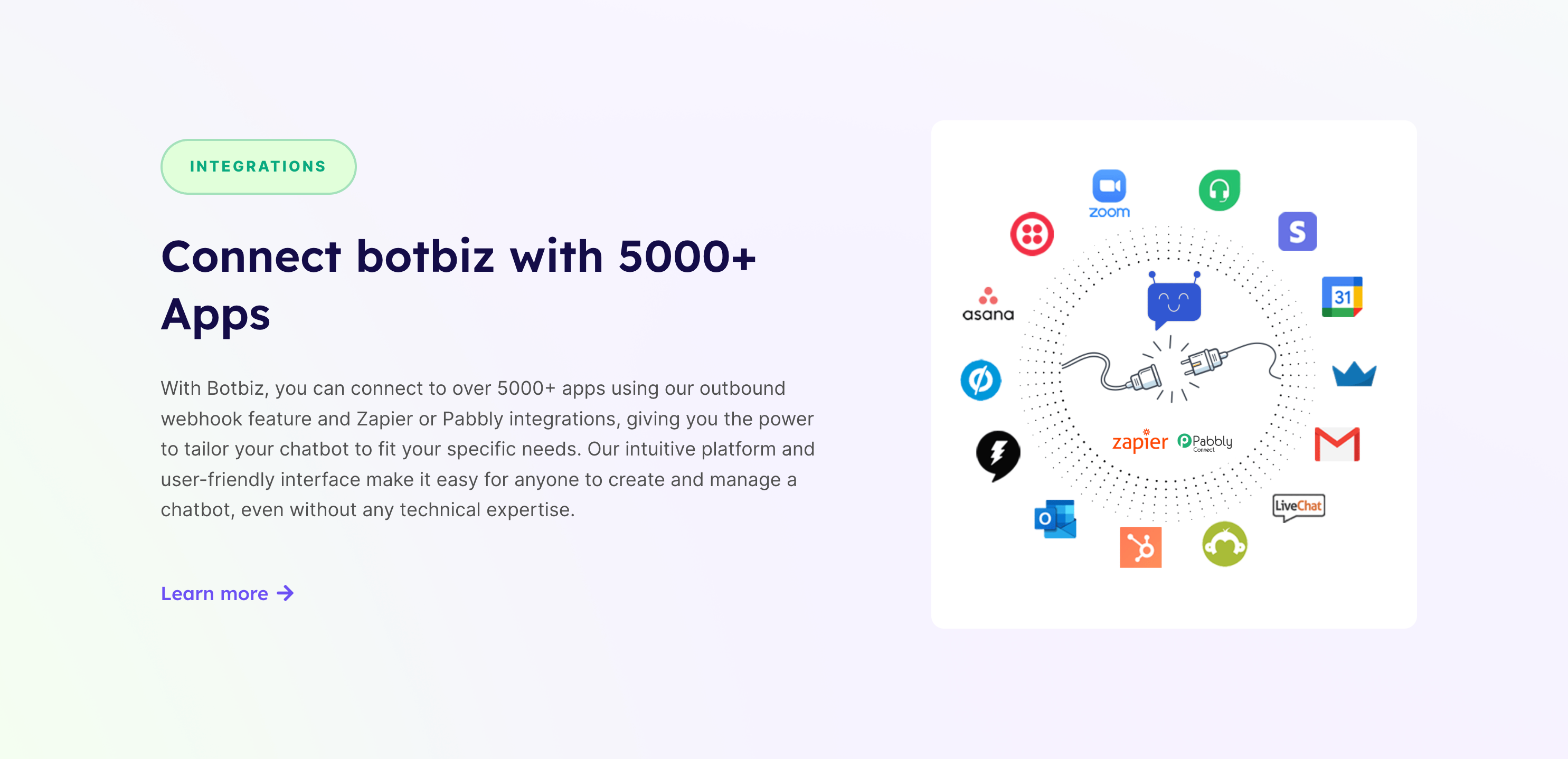 BotBiz bietet auch nahtlose Integration mit beliebten Messaging-Plattformen wie Facebook Messenger, WhatsApp und Slack. Dies hat meine Reichweite erheblich erweitert und es mir ermöglicht, mit Kunden über verschiedene Kanäle zu interagieren. Die nahtlose Integration hat es meinem Team erleichtert, Gespräche zu verwalten und zu überwachen, um schnelle und genaue Antworten auf Kundenanfragen sicherzustellen.