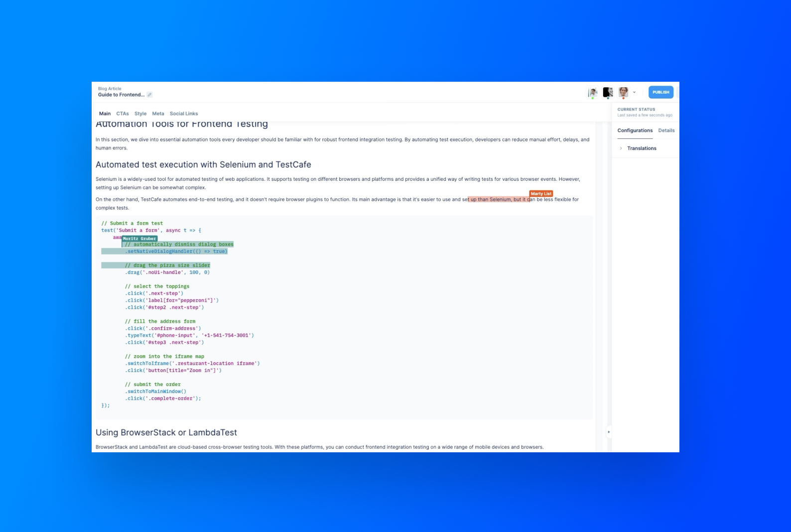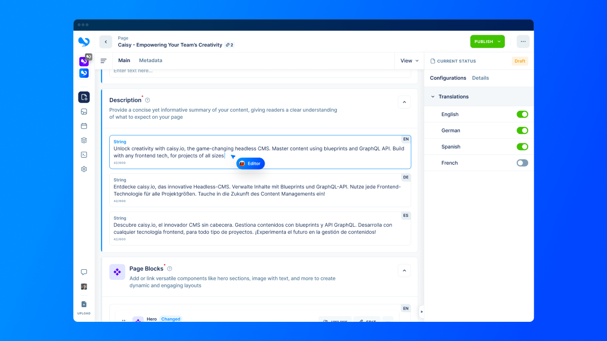 Ich habe mehrere CMS-Plattformen ausprobiert, einschließlich der größten Anbieter – und Caisy hat mich überrascht. Dieses Headless-CMS bietet außergewöhnlichen Wert für seinen Preis (derzeit der beste auf dem Markt, soweit ich verglichen habe) und überraschende Geschwindigkeit. Alles, was man braucht, kann dank des reaktionsschnellen und fähigen Teams dahinter gebaut werden. Die klare Benutzeroberfläche und die Flexibilität haben unsere Kampagnenentwicklung, Test- und Optimierungsprozesse verbessert. Außerdem: Die Multi-Tenancy war für uns ein Wendepunkt. Wir können jetzt alle unsere Projekte für Kunden jeder Größe innerhalb eines einzigen CMS verwalten. Bewertung gesammelt von und auf G2.com gehostet.