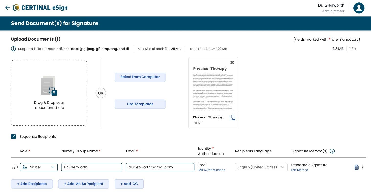 Certinal ist eine unternehmensgerechte eSignature-Plattform, die speziell für das Gesundheitswesen und andere regulierte Branchen entwickelt wurde. Mit Integrationen in über 1.040 Anwendungen ist sie für Umgebungen mit hohem Volumen und mehreren Beteiligten konzipiert, in denen jede Signaturtransaktion eine strukturierte Weiterleitung, eine Genehmigung durch mehrere Parteien, eine Überprüfung der Unterzeichneridentität und auditfähige Nachweise erfordert.