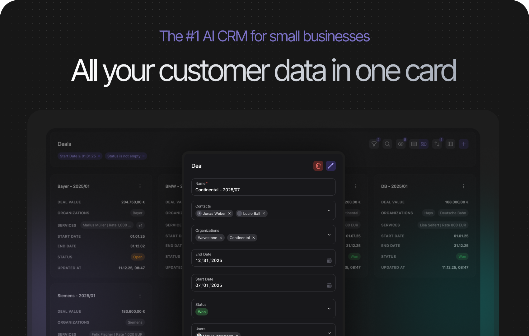 Pipedrive ist eine webbasierte Vertriebs-CRM-Software, die Vertriebsteams ermöglicht, Pipelines zu verfolgen, Leads zu optimieren, Geschäfte zu verwalten und ihren gesamten Vertriebsprozess zu automatisieren, sodass sie sich auf den Verkauf konzentrieren können. Die einfache Benutzeroberfläche von Pipedrive befähigt Vertriebsmitarbeiter, Arbeitsabläufe zu optimieren und ihre Vertriebsaufgaben in einem Arbeitsbereich zu vereinen. Und mit KI-gestützten Funktionen, die personalisierte Tipps bieten, war das Gewinnen und Erneuern von Geschäften noch nie einfacher.