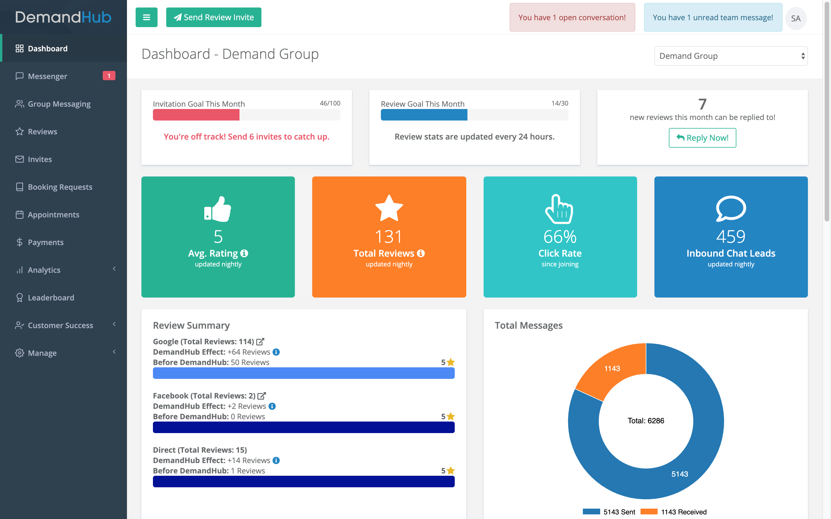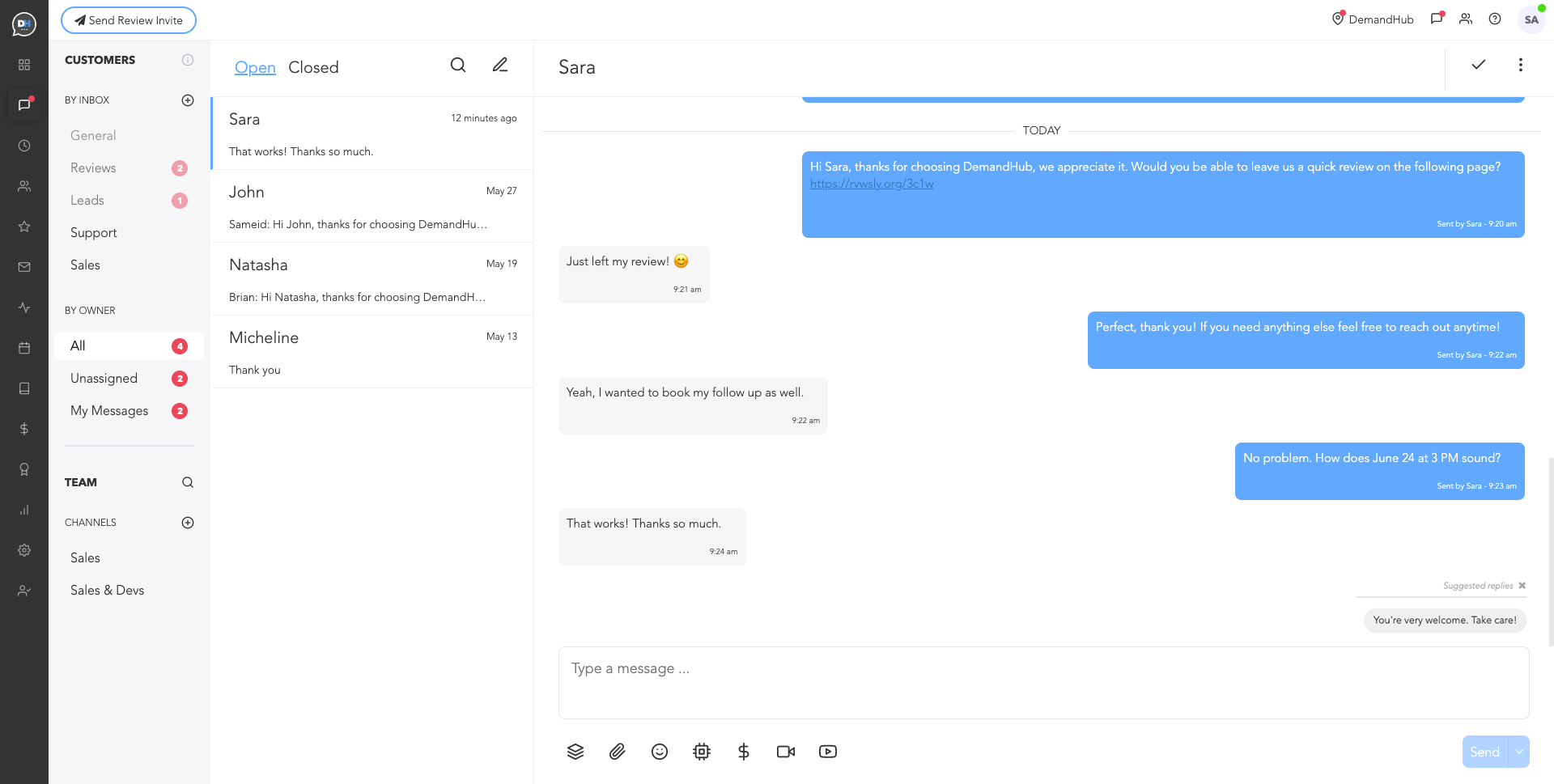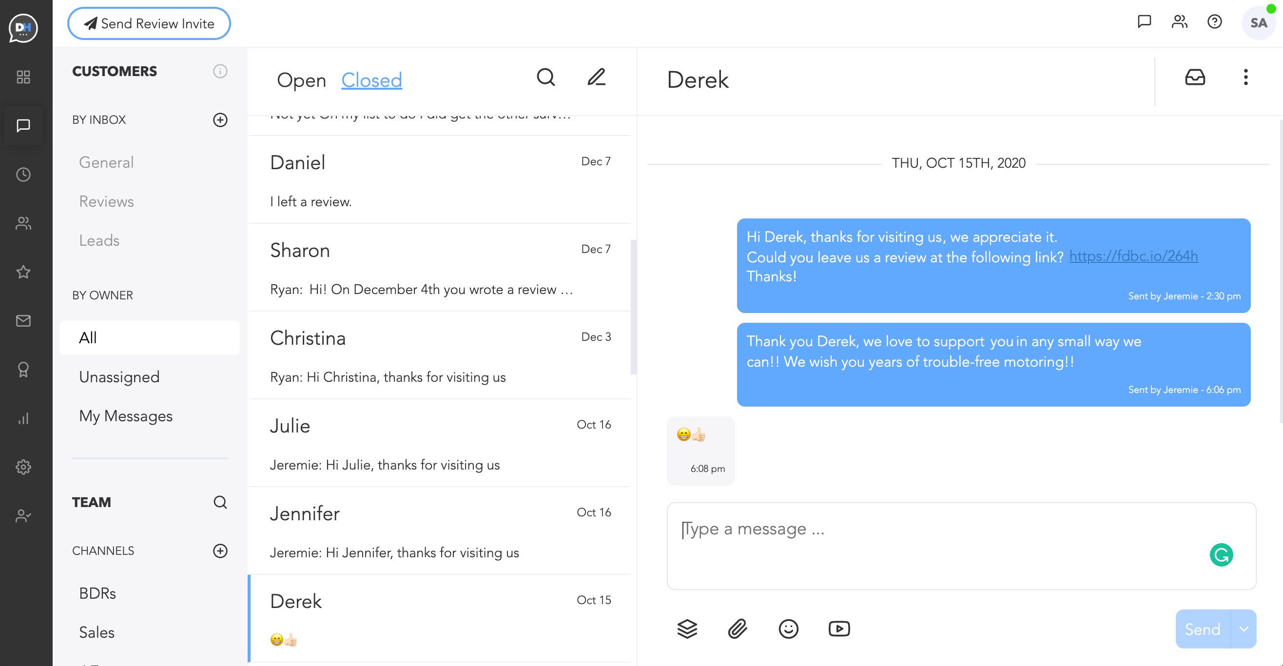 Wir lieben, wie der Chatbot-Chat in einen Textnachrichten-Thread übergeht, sodass der Kunde nicht auf unserer Website bleiben muss, um seine Fragen beantwortet oder einen Termin gebucht zu bekommen! Der Kundensupport ist wirklich reaktionsschnell und hilfsbereit. Bewertung gesammelt von und auf G2.com gehostet.