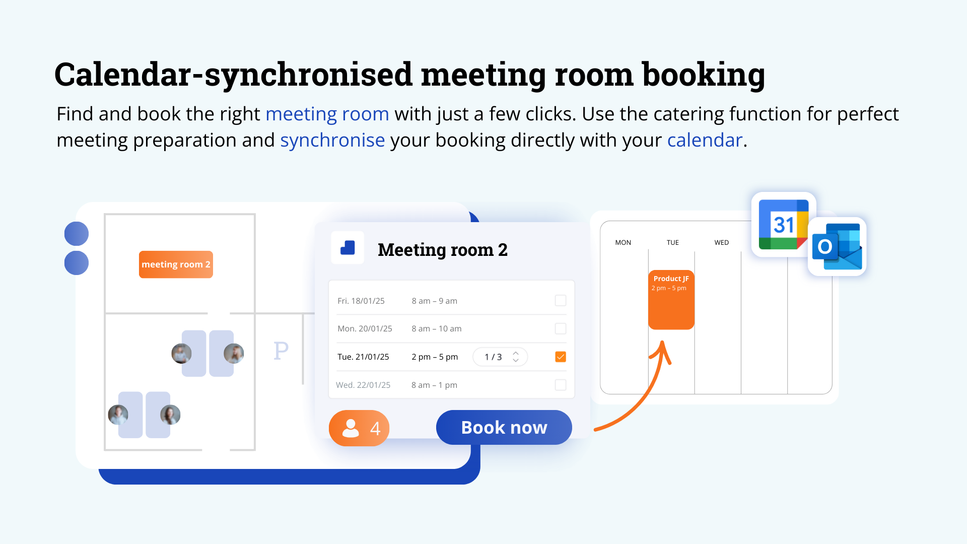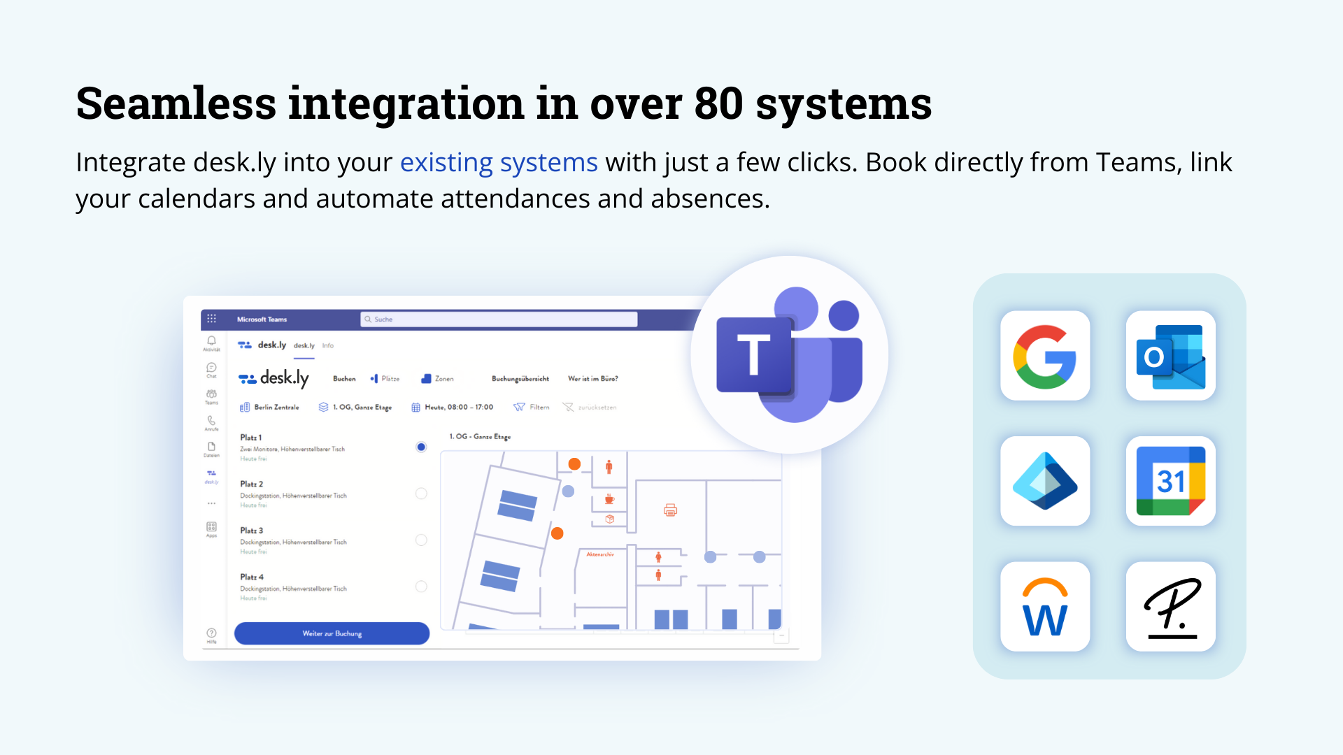Nahtlose Integrationen: Mit SSO, Kalendersynchronisation und Integration in bestehende IT-Infrastrukturen fügt sich desk.ly nahtlos in den täglichen Geschäftsbetrieb ein.