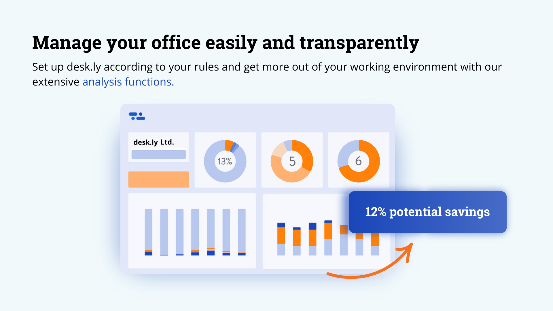 Indem traditionelle Büros in datengesteuerte, flexible Arbeitsumgebungen verwandelt werden, befähigt desk.ly Unternehmen, im zukünftigen Arbeitsumfeld wettbewerbsfähig zu bleiben. Ob das Ziel darin besteht, das Mitarbeitererlebnis zu verbessern, die Zusammenarbeit zu fördern oder die Büroeffizienz zu maximieren, desk.ly ist die ideale Lösung, um das volle Potenzial jedes Arbeitsplatzes freizuschalten.