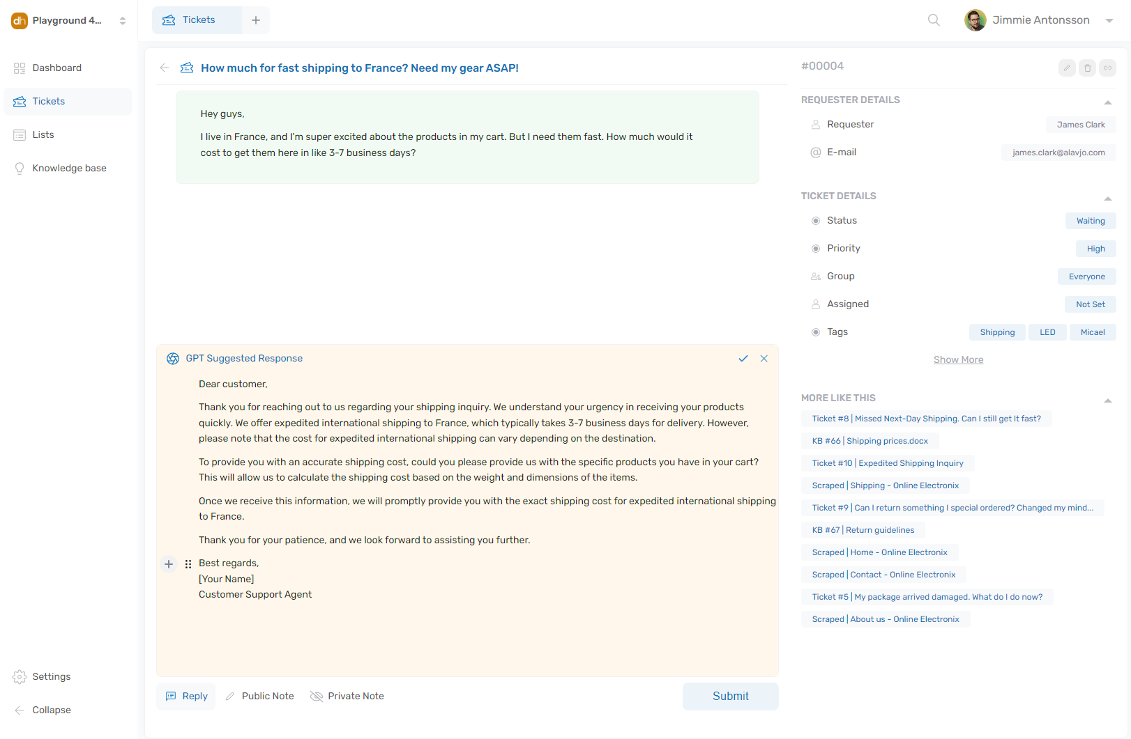 Deskhero ist sehr einfach zu konfigurieren und Sie werden in kurzer Zeit betriebsbereit sein. Die erweiterte KB-Artikelbibliothek, in der Sie Daten über Ihr Produktportfolio speichern und dann verwenden können, um automatisch Support-Antworten an Endbenutzer zu senden, ist ein Wendepunkt. Die Wissensdatenbank wird definitiv das Epizentrum sein, in dem Ihre Organisation arbeiten wird, um das KI-Modell für präzisere Antworten und Vorschläge zu bereichern.