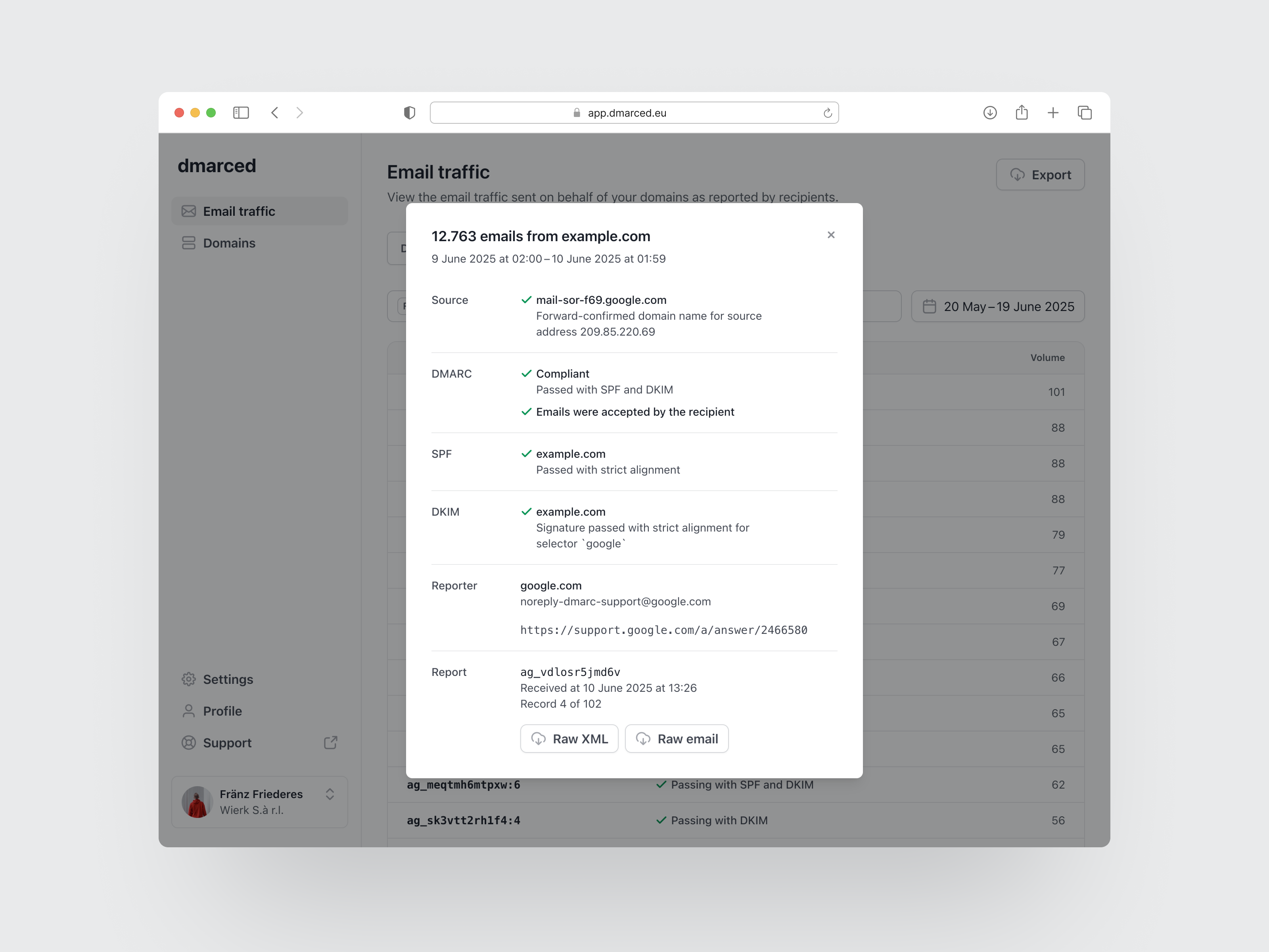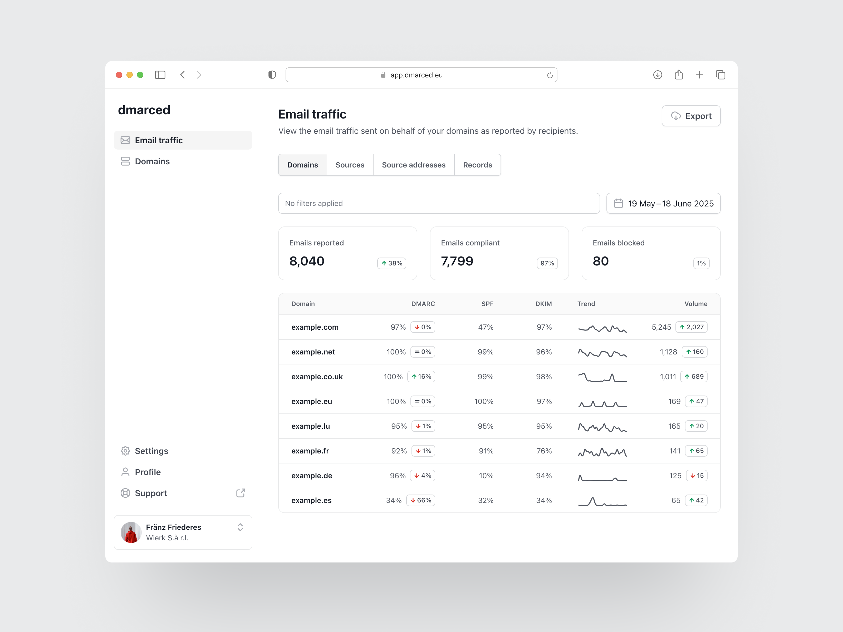 Speziell für MSPs und große Domain-Portfolio-Berichterstattung entwickelt, ist DMARC Report ein leistungsstarkes Berichtswerkzeug zur Messung der Qualität ausgehender E-Mails und zur Überwachung hinterhältiger Cyberangriffe. Sie können Ihre ausgehenden E-Mails vor Bedrohungen wie Domain-Fälschung, E-Mail-Spoofing und anderen Phishing-Angriffen schützen.
