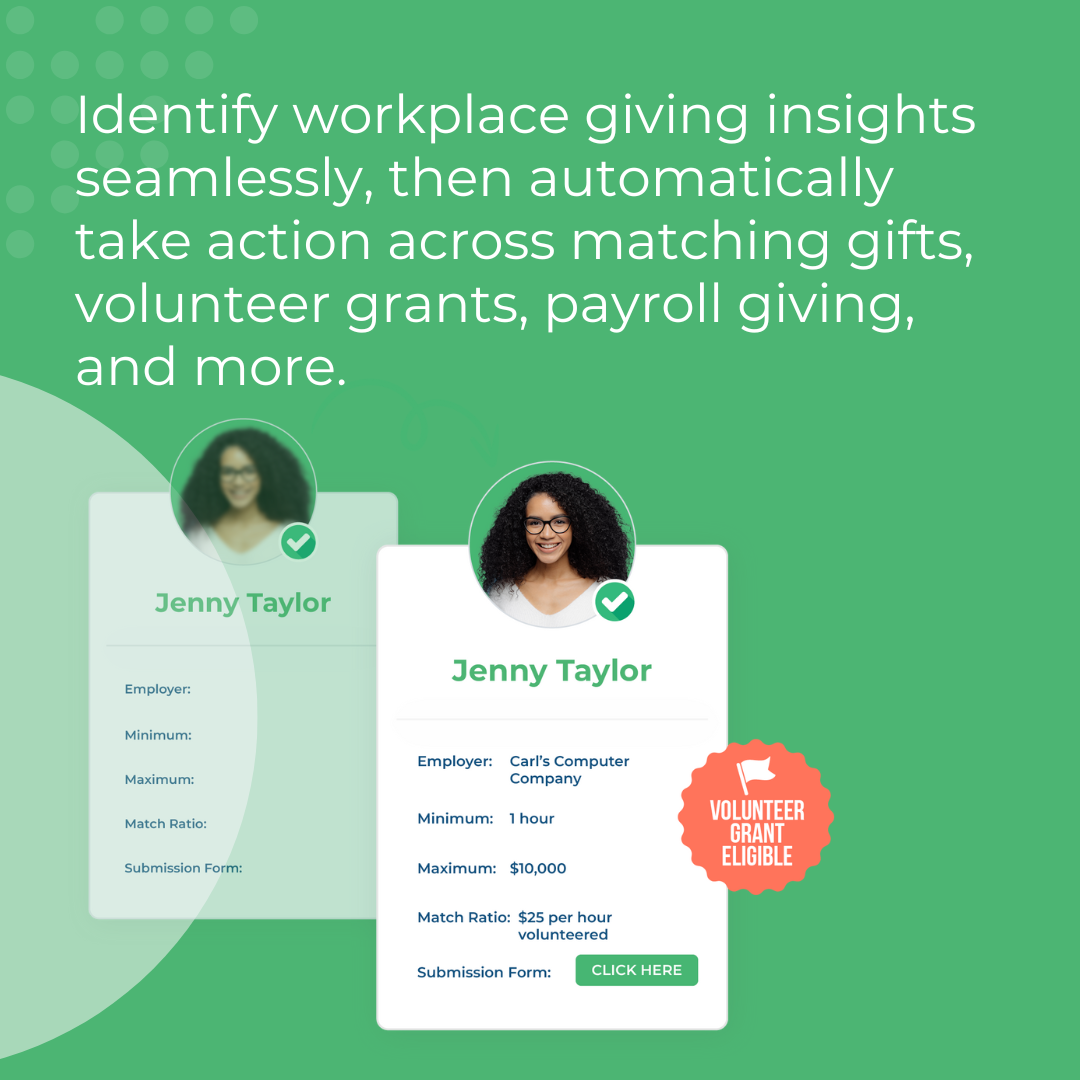 Double the Donation unterstützt Organisationen auch dabei, ihre Freiwilligen und Mitarbeiter-Spender effektiver einzubinden. Durch Tools, die die Berechtigung für Freiwilligenzuschüsse und Gehaltsabzugsmöglichkeiten hervorheben, können Nonprofits die Gesamtbeiträge erhöhen und langfristige Beziehungen zu Unterstützern und Unternehmenspartnern stärken.