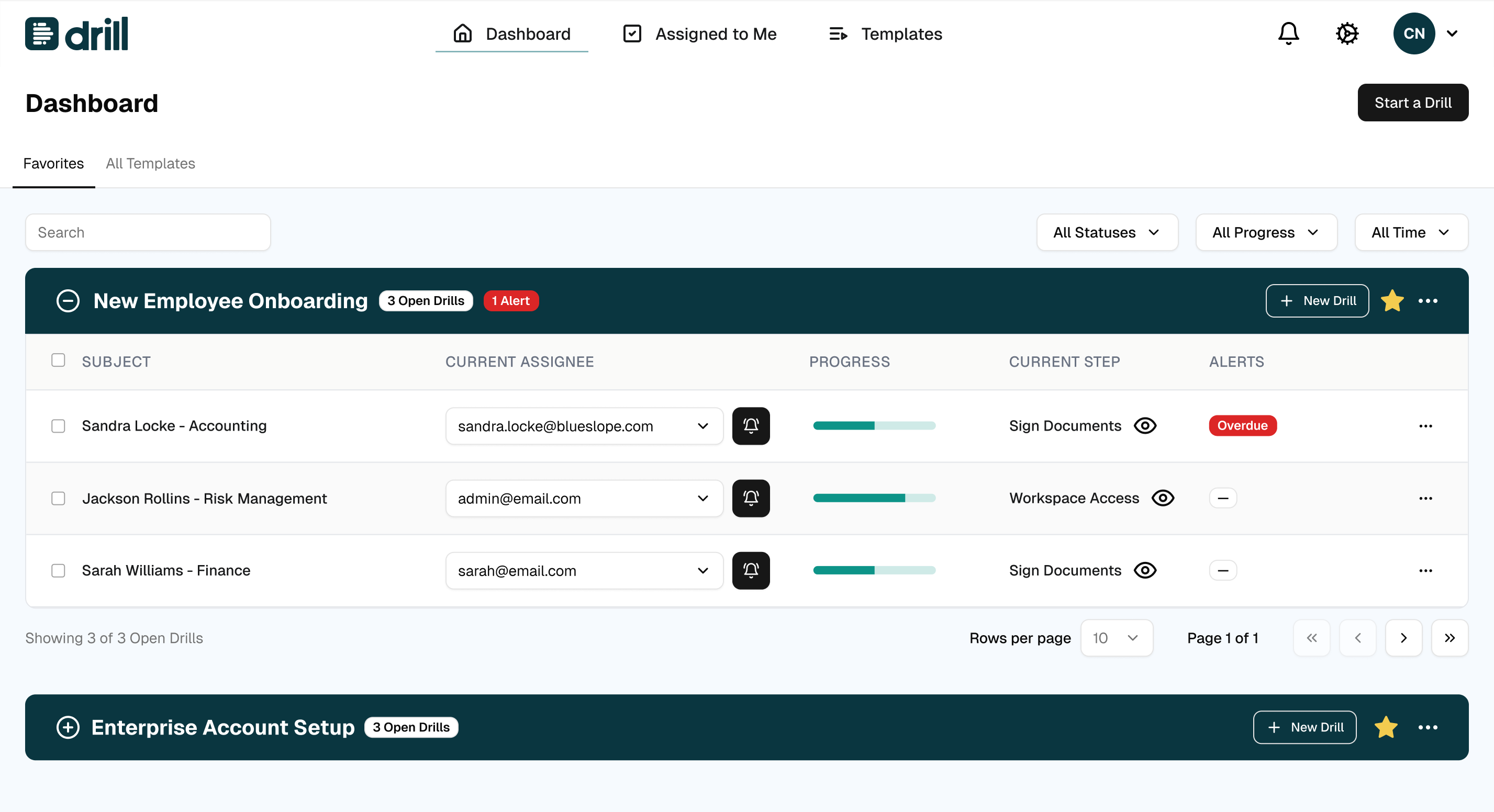 Ein Drill ist ein strukturierter Workflow, der aus einer Vorlage oder von Grund auf neu erstellt wird. Er definiert eine Abfolge von Aktionen, Bedingungen und Einschränkungen, die die Ausführung leiten.