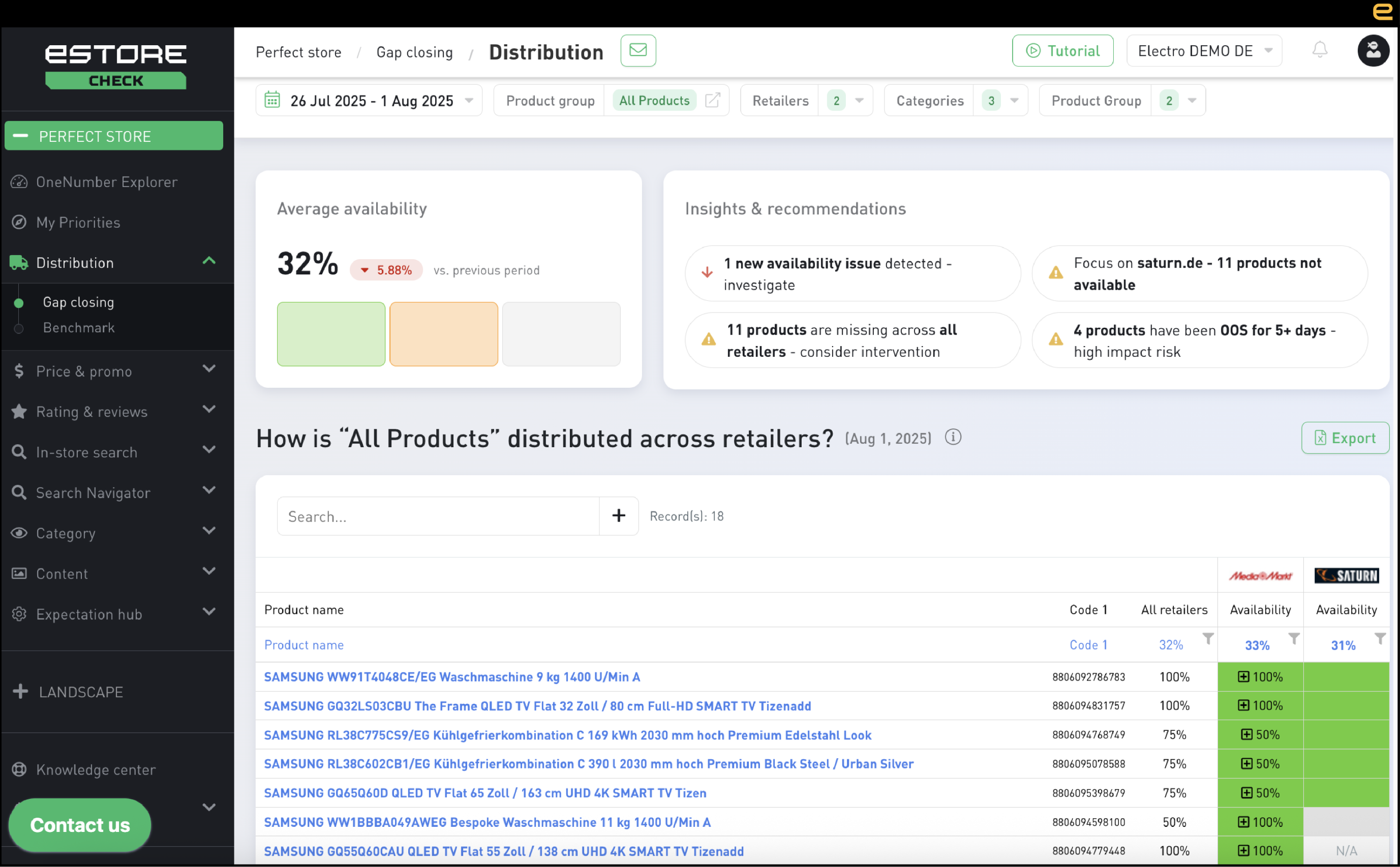 eStore bietet die höchste Datenqualität in der Branche (99%+ im Vergleich zum Branchendurchschnitt von 95%). Wir wissen auch, dass Ihre Marke einzigartig ist. Unsere Plattform passt sich Ihren spezifischen Bedürfnissen, Geschäftszielen und sogar Ihrer internen Terminologie an. Wir konzentrieren uns auch auf das eCategory Management. Während sich andere ausschließlich auf Ihre Markenleistung konzentrieren, helfen wir Ihnen, das Kategoriewachstum mit Einzelhändlern voranzutreiben und Win-Win-Partnerschaften zu schaffen.