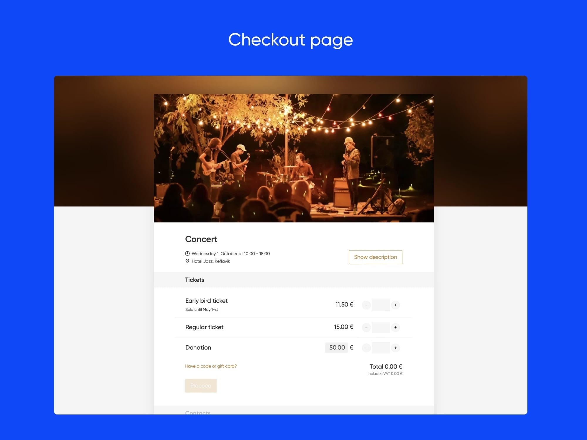 A clean, user-friendly checkout page that makes purchasing tickets effortless. Customers can quickly select ticket types, apply discounts, and complete their order in just a few steps - helping maximize conversions and reduce drop-offs.