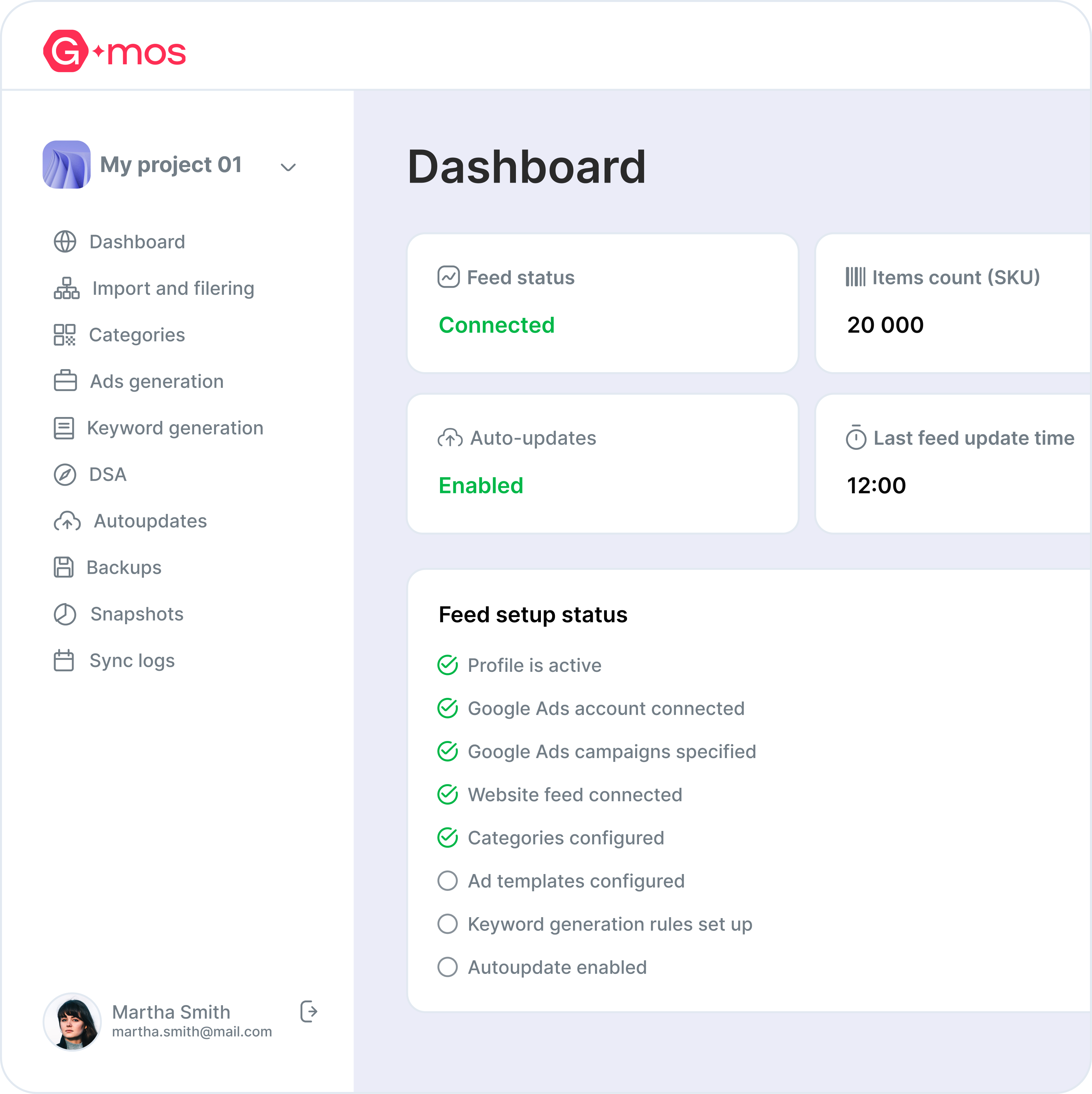 Im Kern generiert G-MOS dynamisch Tausende von hochrelevanten Suchanzeigen basierend auf Produktfeeds oder Website-Inhalten. Anzeigen werden in Echtzeit automatisch aktualisiert, wenn sich Preise, Verfügbarkeit, Kategorien oder Produkteigenschaften ändern, um sicherzustellen, dass Kampagnen stets die neuesten Geschäftsdaten widerspiegeln. Dies eliminiert veraltete Anzeigen, manuelle Massenbearbeitungen und das operationelle Risiko, das mit der manuellen Verwaltung von Google Ads-Konten einhergeht.