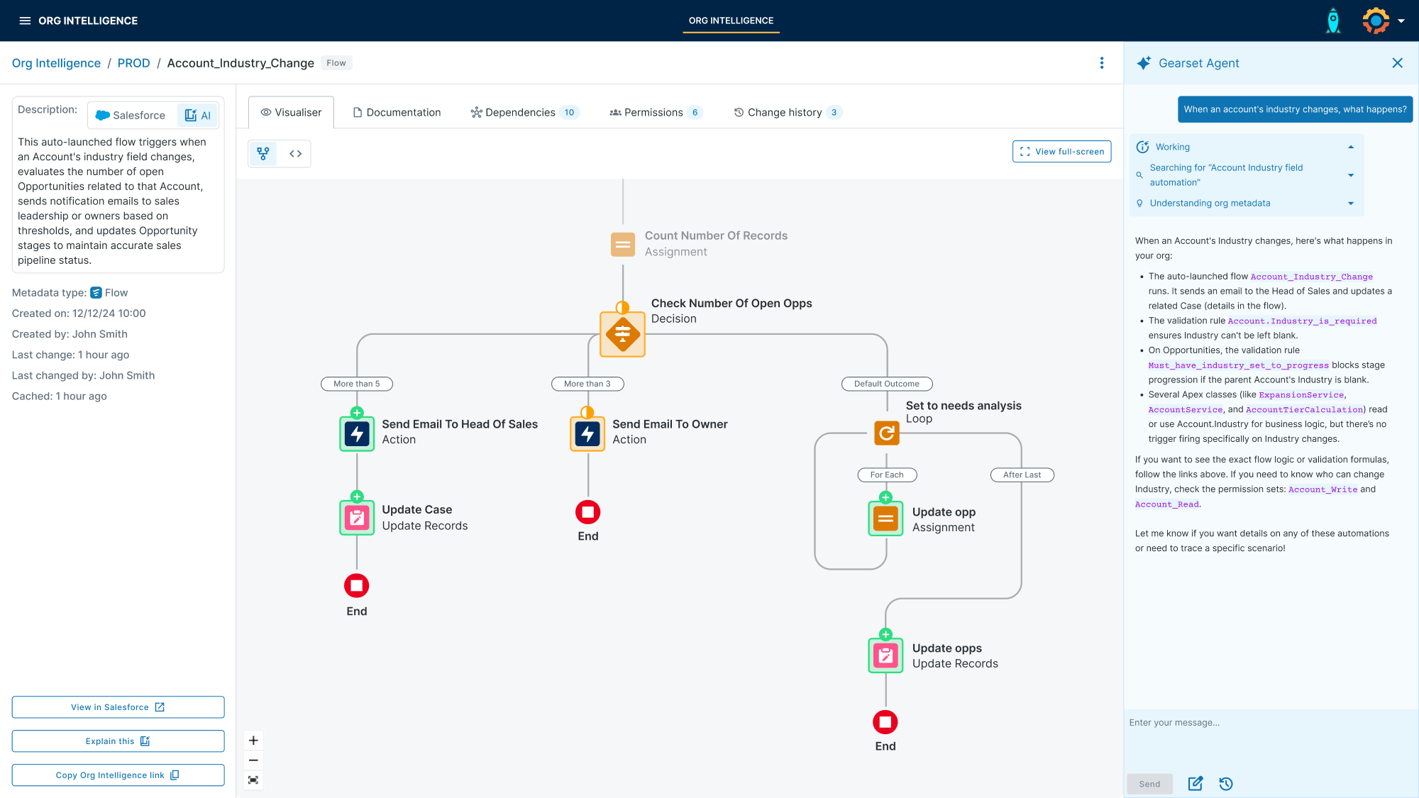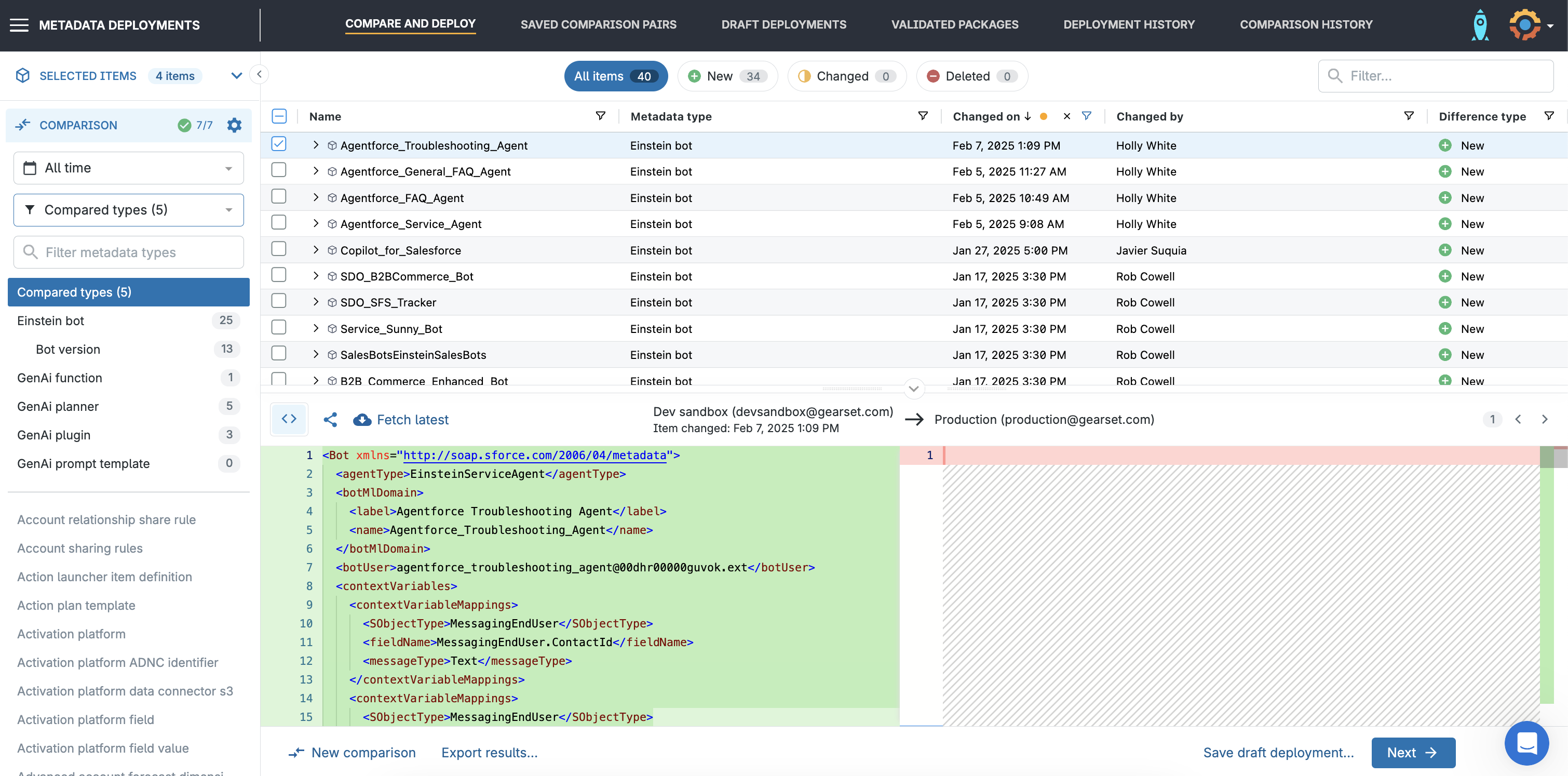 Die Plattform unterstützt eine Vielzahl von Salesforce-Anwendungsfällen, einschließlich Metadaten- und CPQ-Bereitstellungen, CI/CD-Automatisierung, Code-Review-Workflows, Sandbox-Seeding, Testautomatisierung und Überwachung. Neben der Bereitstellungsautomatisierung umfasst Gearset Tools für den Schutz von Salesforce-Daten und das langfristige Datenmanagement, wie automatisierte Backups, Datenwiederherstellung und Archivierung. Funktionen zur Beobachtbarkeit und Org Intelligence bieten Einblicke in die Org-Gesundheit, das Bereitstellungsrisiko und Systemänderungen im Laufe der Zeit.