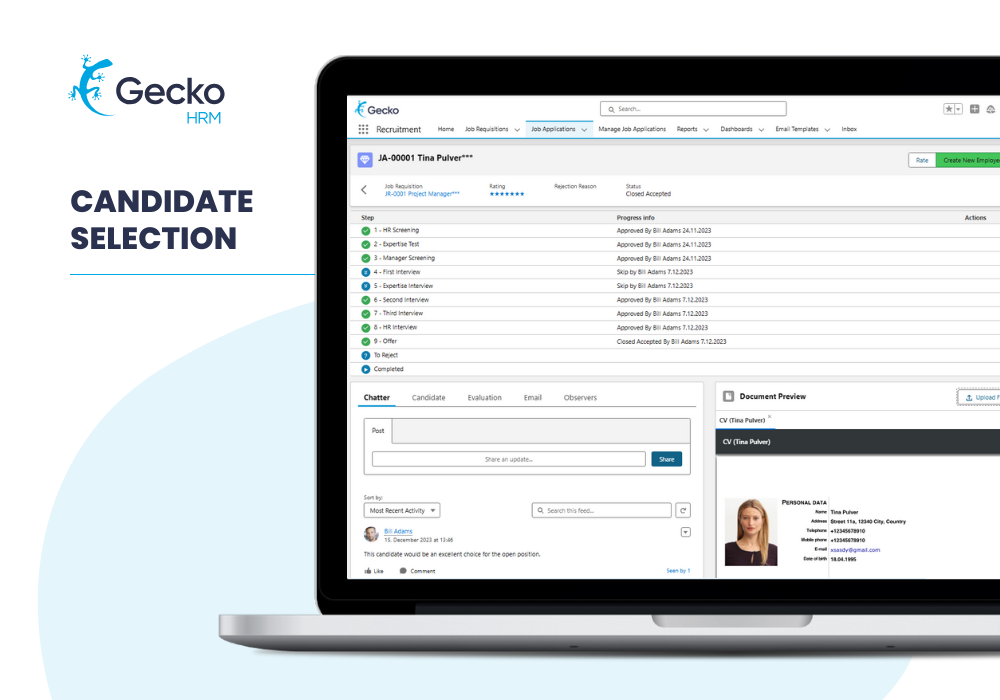 Gecko HRM ist nicht Ihr altmodisches HR-System. Es ist eine Anwendung, die auf der Salesforce®-Plattform, dem globalen Technologieführer im Bereich Cloud, aufgebaut ist. Gecko konzentriert sich auf Prozessautomatisierung, Talentmanagement und Mitarbeiterengagement.