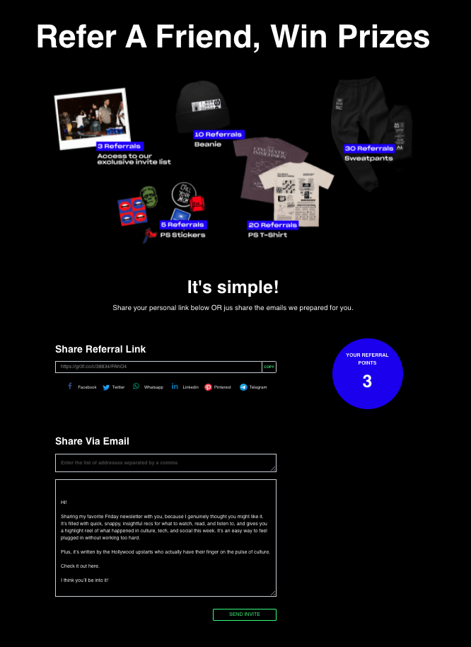 Referral Factory ist eine unglaublich einfach zu bedienende Lösung für Empfehlungsmarketing, die darauf abzielt, Ihnen zu helfen, mehr empfohlene Kunden zu gewinnen. Sie können 'Ihr eigenes Empfehlungsprogramm in weniger als 5 Minuten erstellen'. Mit Zugriff auf über 1000 vorgefertigte Empfehlungsprogrammvorlagen können Sie entweder eine Vorlage kopieren oder Ihr eigenes Empfehlungsprogramm von Grund auf neu erstellen.