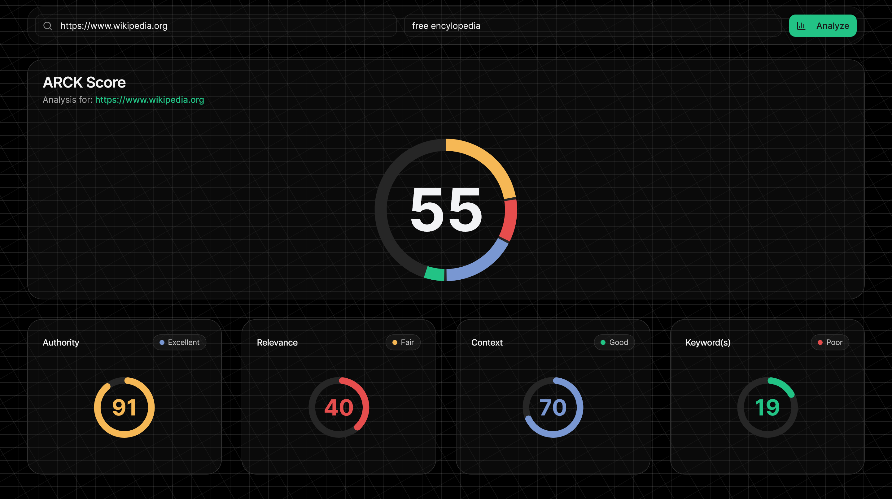 Im Kern der Plattform steht der ARCK Score, GEOScore's proprietäres Bewertungsmodell, das auf vier Schlüsselparametern basiert: Autorität, Relevanz, Kontext und Keyword-Stärke. Benutzer können sofort eine Wahrscheinlichkeitsbewertung berechnen, indem sie eine Anfrage und eine Webseiten-URL eingeben, die ihre potenzielle Sichtbarkeit in KI-generierten Antworten widerspiegelt.