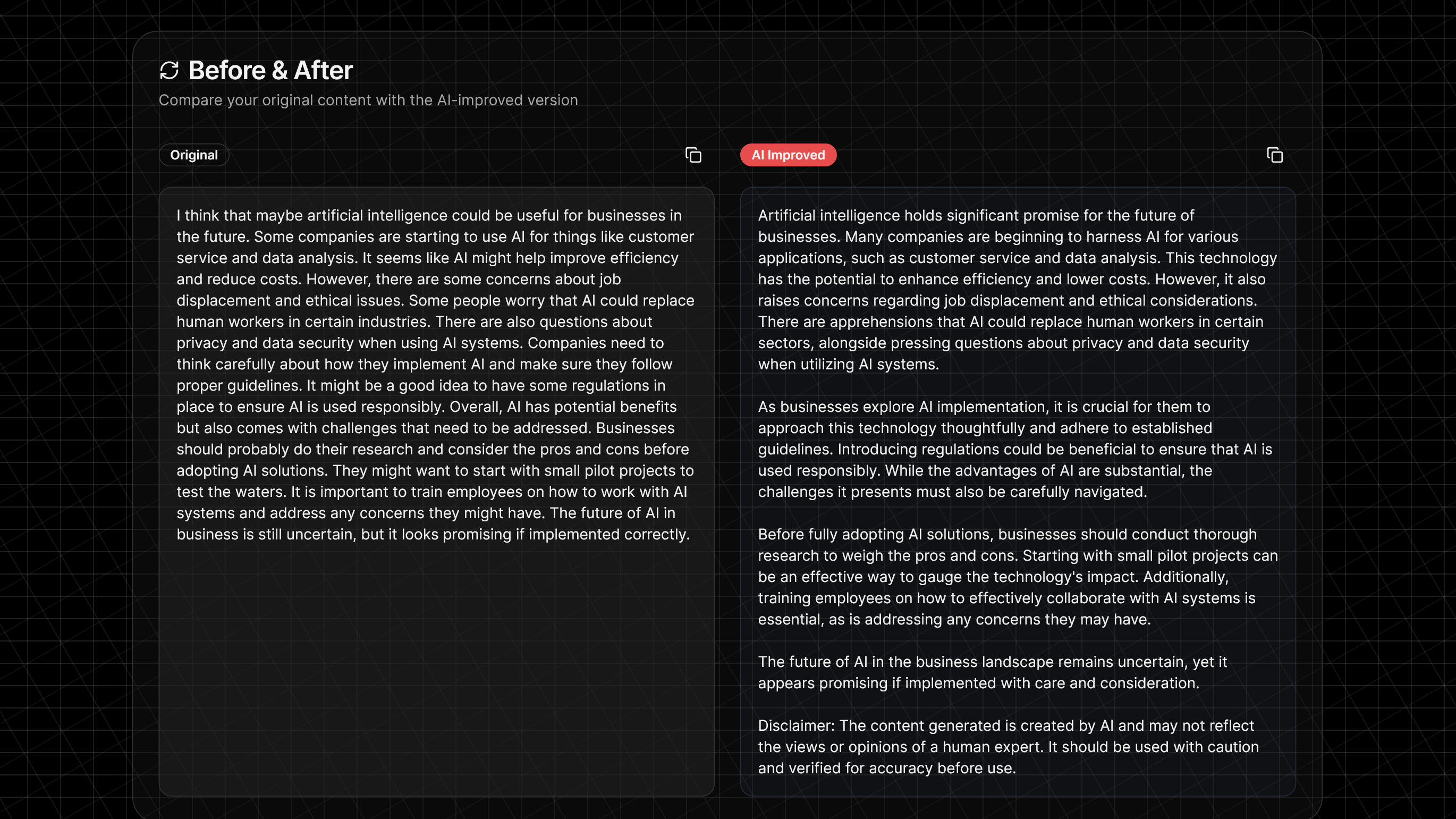 GEOScore geht über die Analyse hinaus, es ist darauf ausgelegt, Verbesserungen voranzutreiben. Benutzer können ihre Bewertungen mit denen der Konkurrenz vergleichen, die Faktoren aufdecken, die konkurrierende Seiten referenzwürdiger machen, und die integrierte Funktion „Inhalt verbessern“ nutzen, um ihre eigenen Webseiten für eine bessere Leistung umzuschreiben oder zu optimieren.