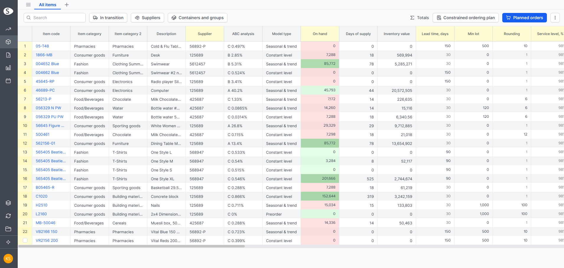 Streamline glänzt in der Materialbedarfsplanung (MRP) durch die Erstellung umfassender Pläne basierend auf Bedarfsprognosen und Stücklisten (BoM). Diese Funktion ist besonders vorteilhaft für Unternehmen, die mit Lieferantenunvorhersehbarkeiten und Störungen in historischen Daten konfrontiert sind, da sie eine effektive Planung auch ohne vorherige Verkaufsdaten ermöglicht. Durch das automatische Ausbalancieren verschiedener Faktoren minimiert die Plattform die Risiken von Überbeständen und Fehlbeständen, hält optimale Lagerbestände aufrecht und verbessert das Cashflow-Management.