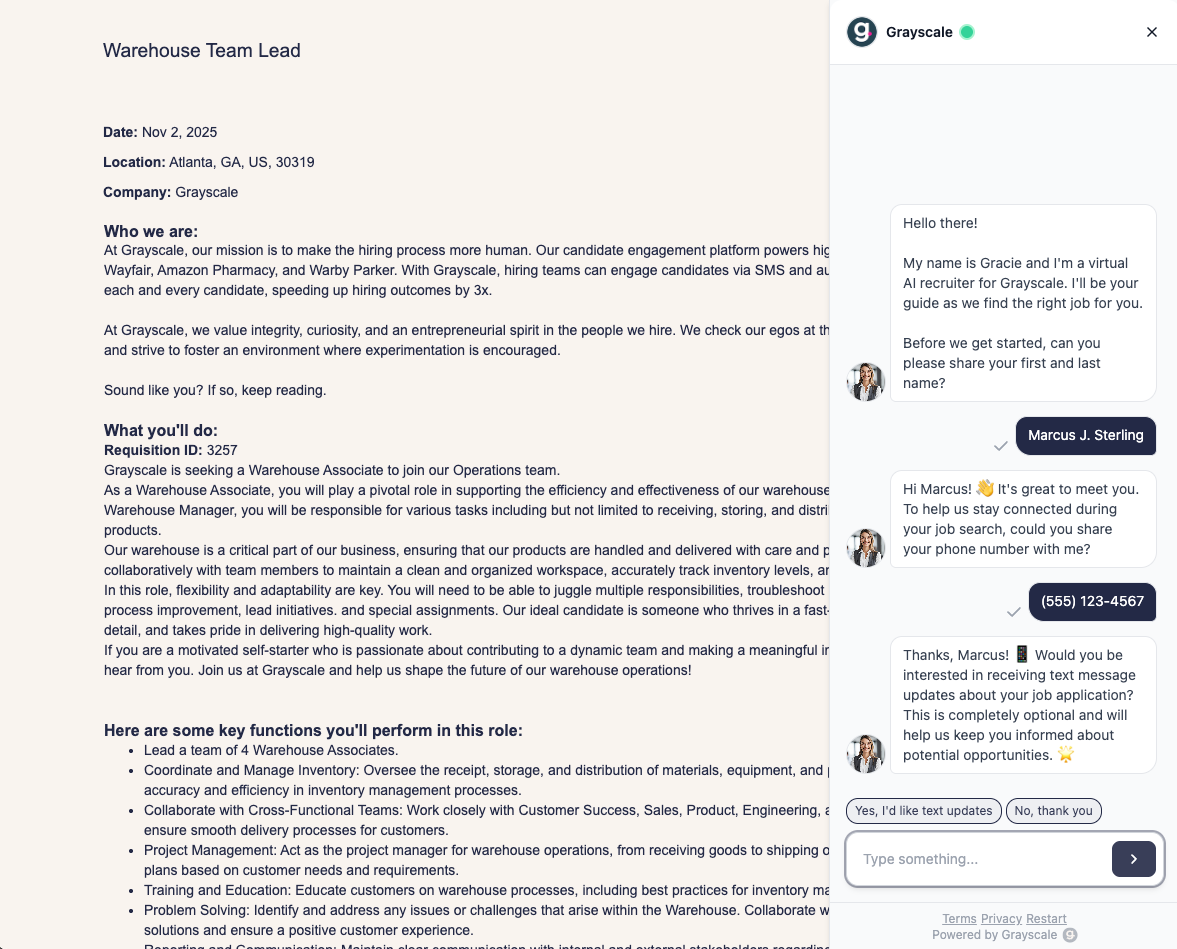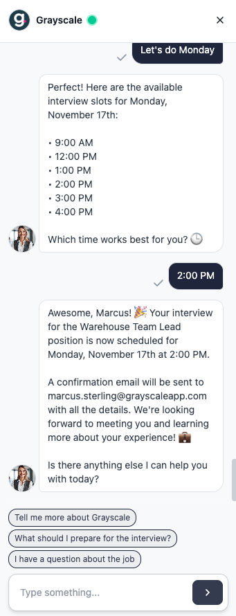 Vielen Dank, dass Sie diese durchdachte Bewertung geteilt haben! Wir freuen uns sehr zu hören, dass Grayscale Ihnen geholfen hat, Ihren Einstellungsprozess zu vereinfachen, von der Kommunikation mit den Kandidaten und der Terminplanung von Interviews bis hin zur Automatisierung und Analyse. Es ist großartig zu wissen, dass unsere KI-Funktionen Ihnen Zeit bei sich wiederholenden Aufgaben sparen und gleichzeitig die Kandidatenbindung verbessern. Wir schätzen Ihr Feedback wirklich und freuen uns darauf, Ihre Rekrutierungsziele weiterhin zu unterstützen, während Sie wachsen. Danke, dass Sie Teil der Grayscale-Community sind!
