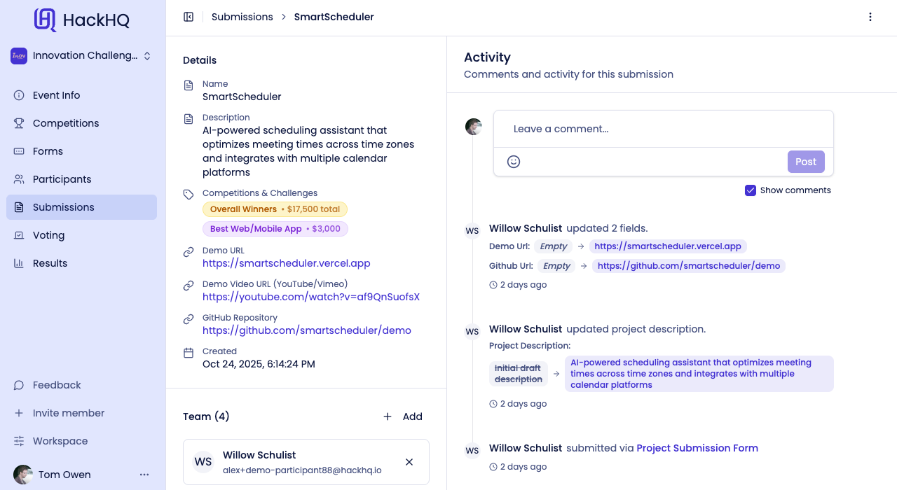 HackTribe stellt eine vollständige Lösung für die Organisation erfolgreicher Hackathons dar, ausgestattet mit Funktionen, die Effizienz, Transparenz und ein großartiges Erlebnis für Organisatoren, Teilnehmer und Juroren gleichermaßen gewährleisten.