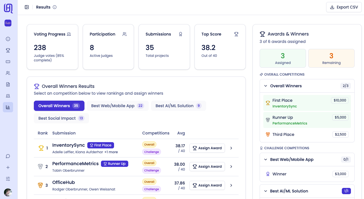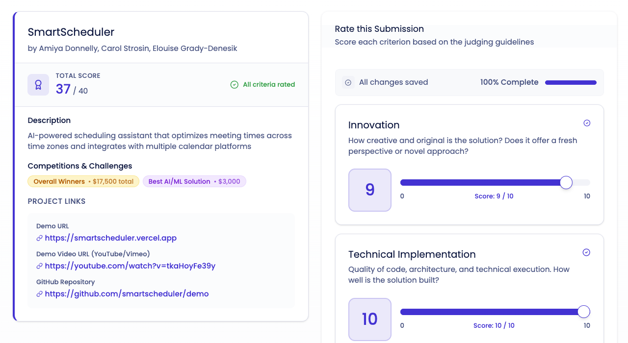 Integriertes Dashboard: Intuitive Dashboards und Bewertungsportale für Juroren und Administratoren für eine nahtlose Bewertung und Verwaltung.
