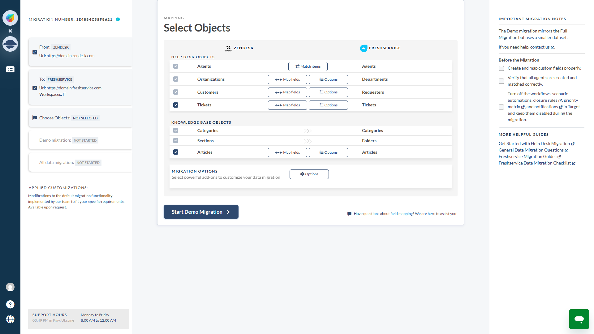 Help Desk Migration bewahrt 100 % Ihrer historischen Supportdaten, einschließlich Tickets und Vorfälle, Gespräche, Benutzer, Organisationen, Agenten, Wissensdatenbankartikel, Strukturen, Status, Prioritäten und Beziehungen zwischen Datensätzen.