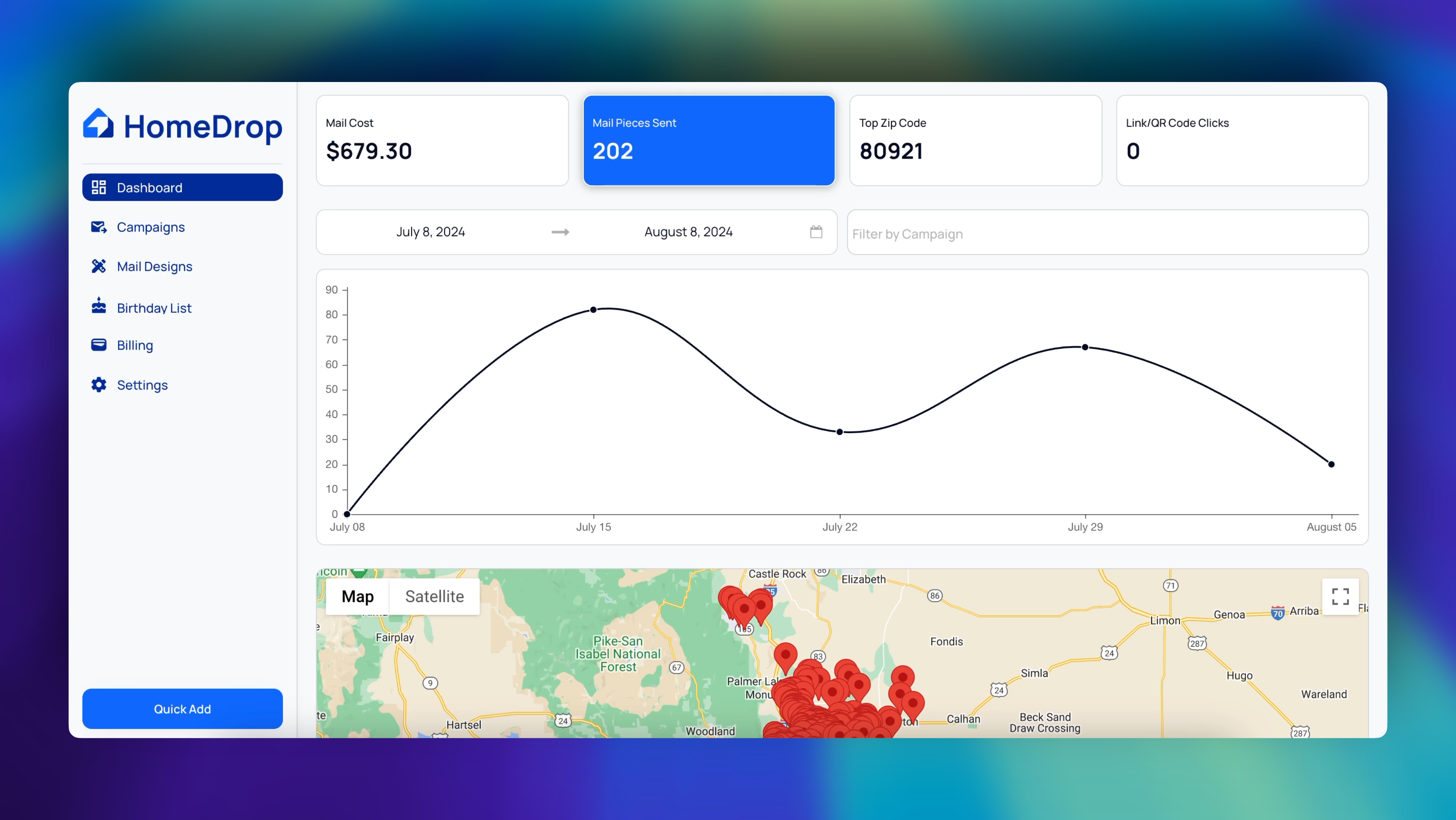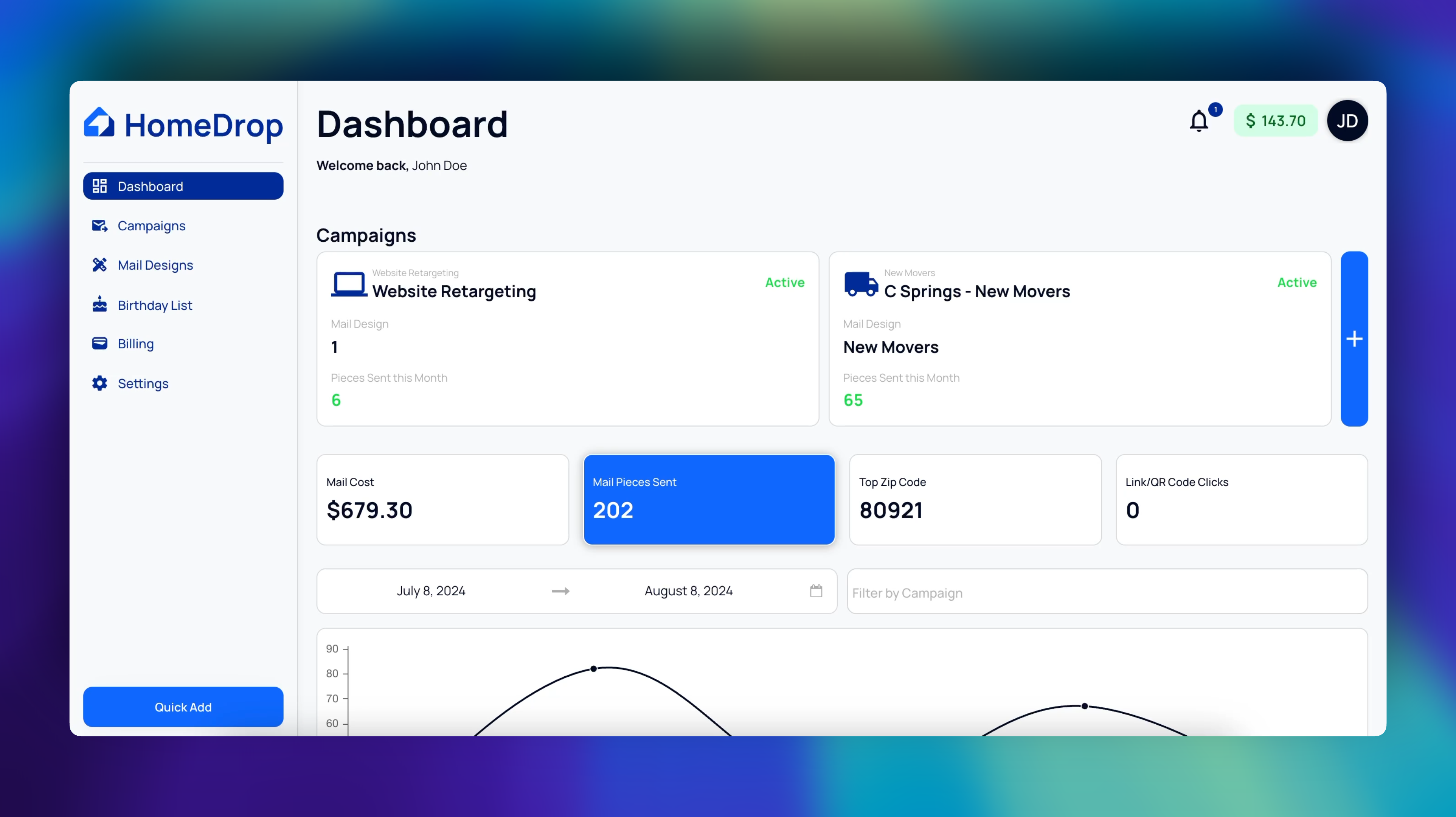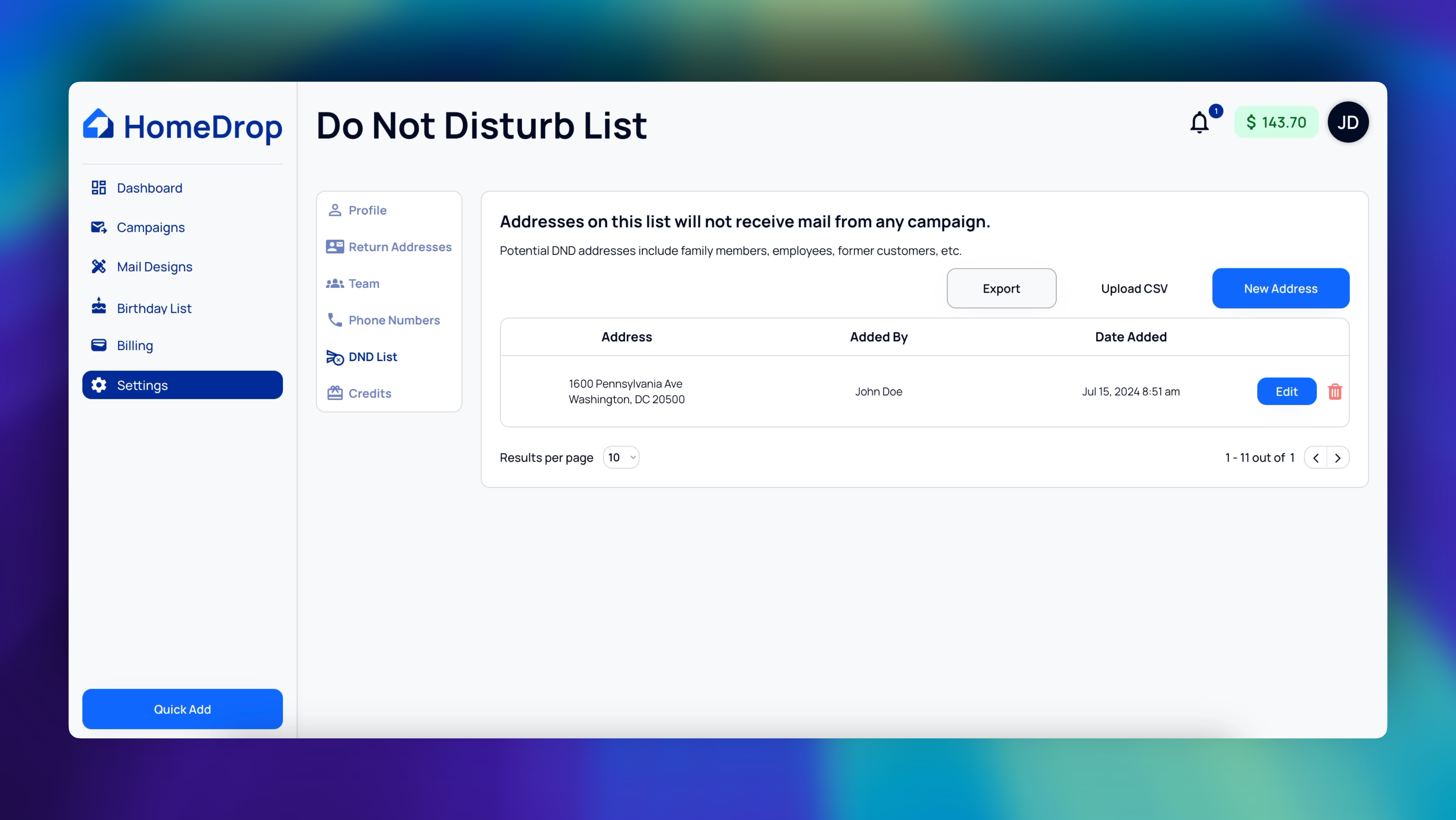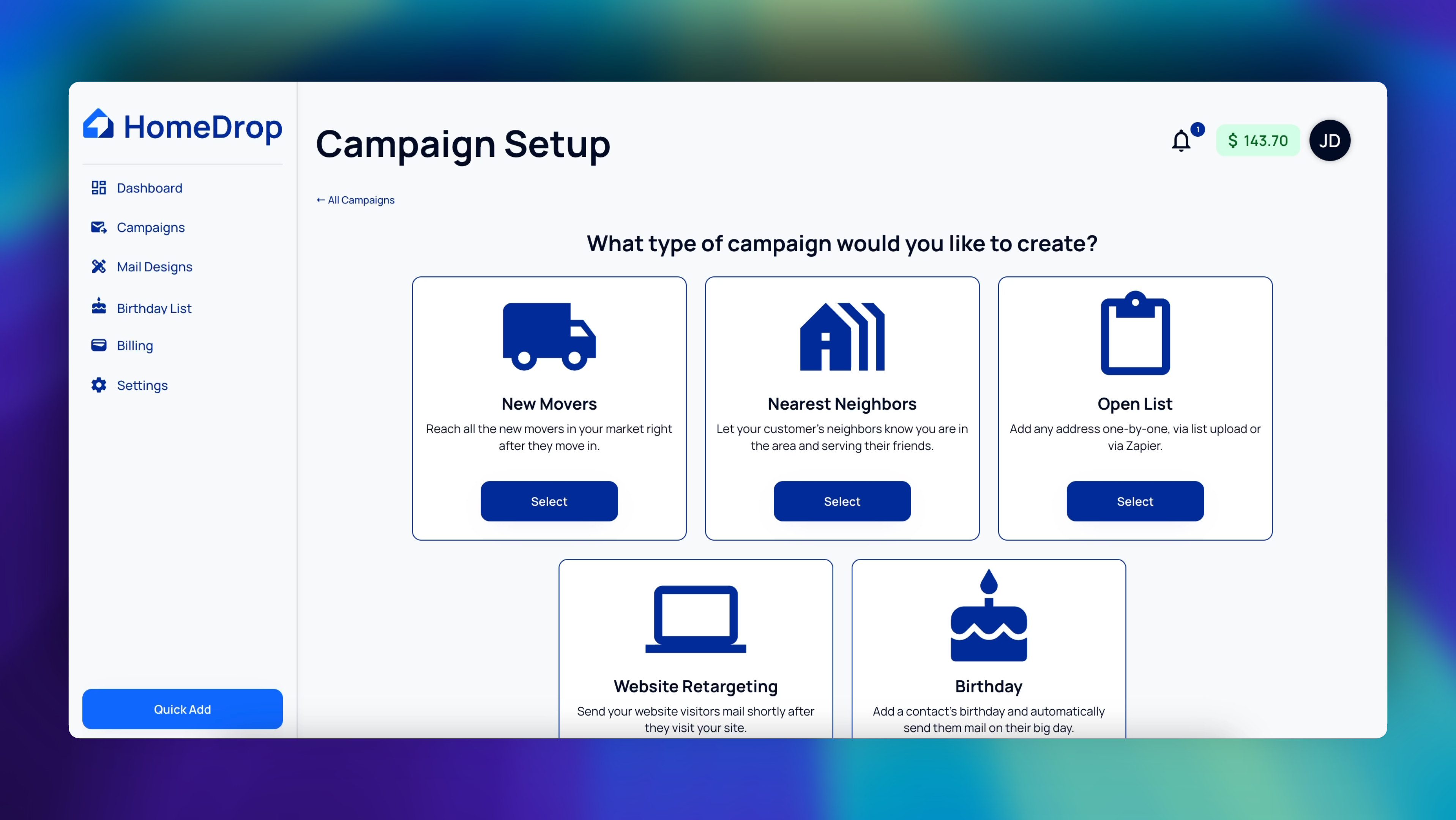 Homedrop erfordert keine Mindestanforderungen für Post. Die Nachbarn-Mail-Funktion ist großartig! Ich liebe die Tatsache, dass ich Post an Leute senden kann, sobald sie einziehen, und sogar nur Neubauten filtern kann. Das macht mein Leben so viel einfacher. Es hat mein Geschäft für immer verändert. LIEBE ES! Bewertung gesammelt von und auf G2.com gehostet.