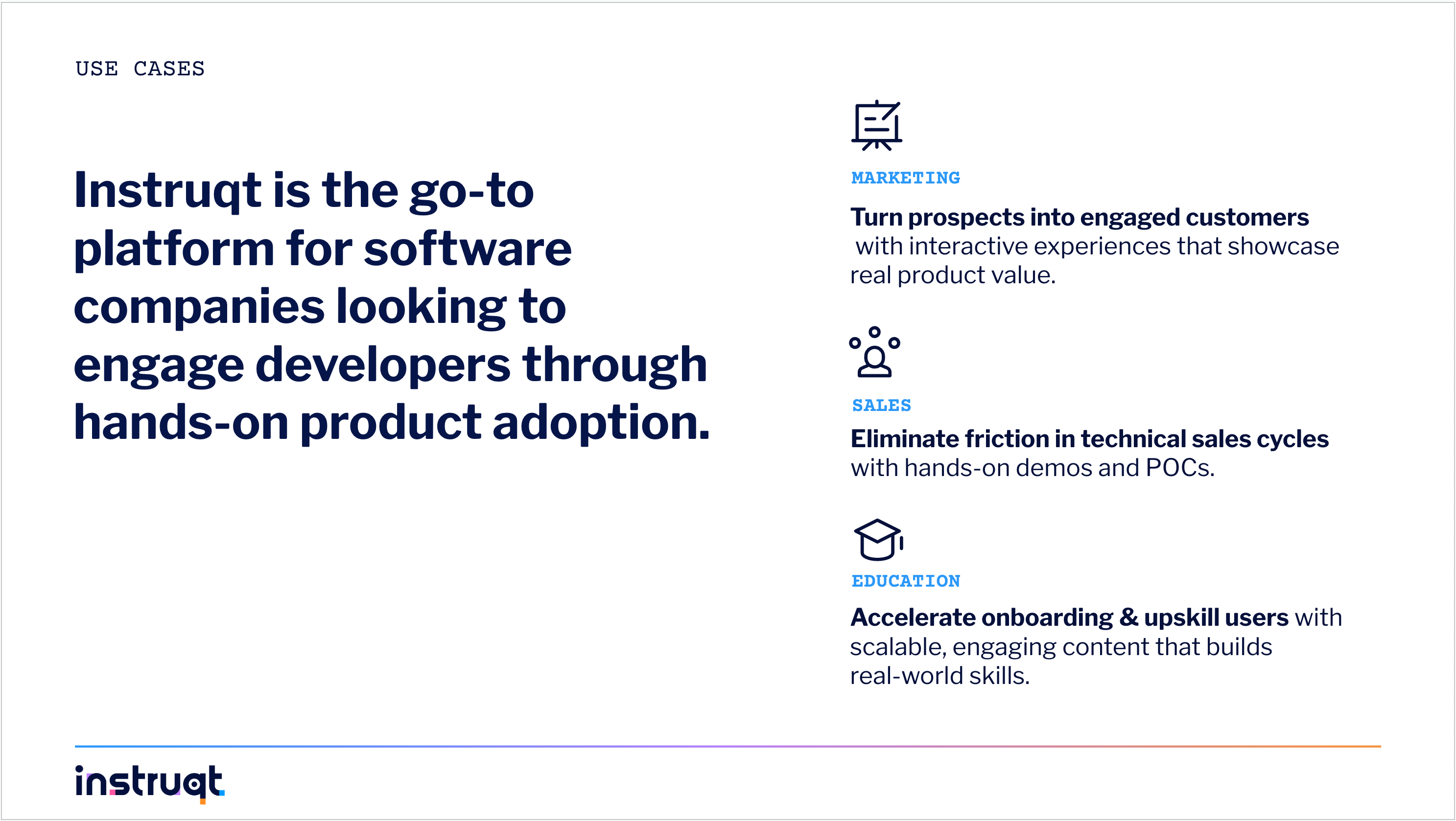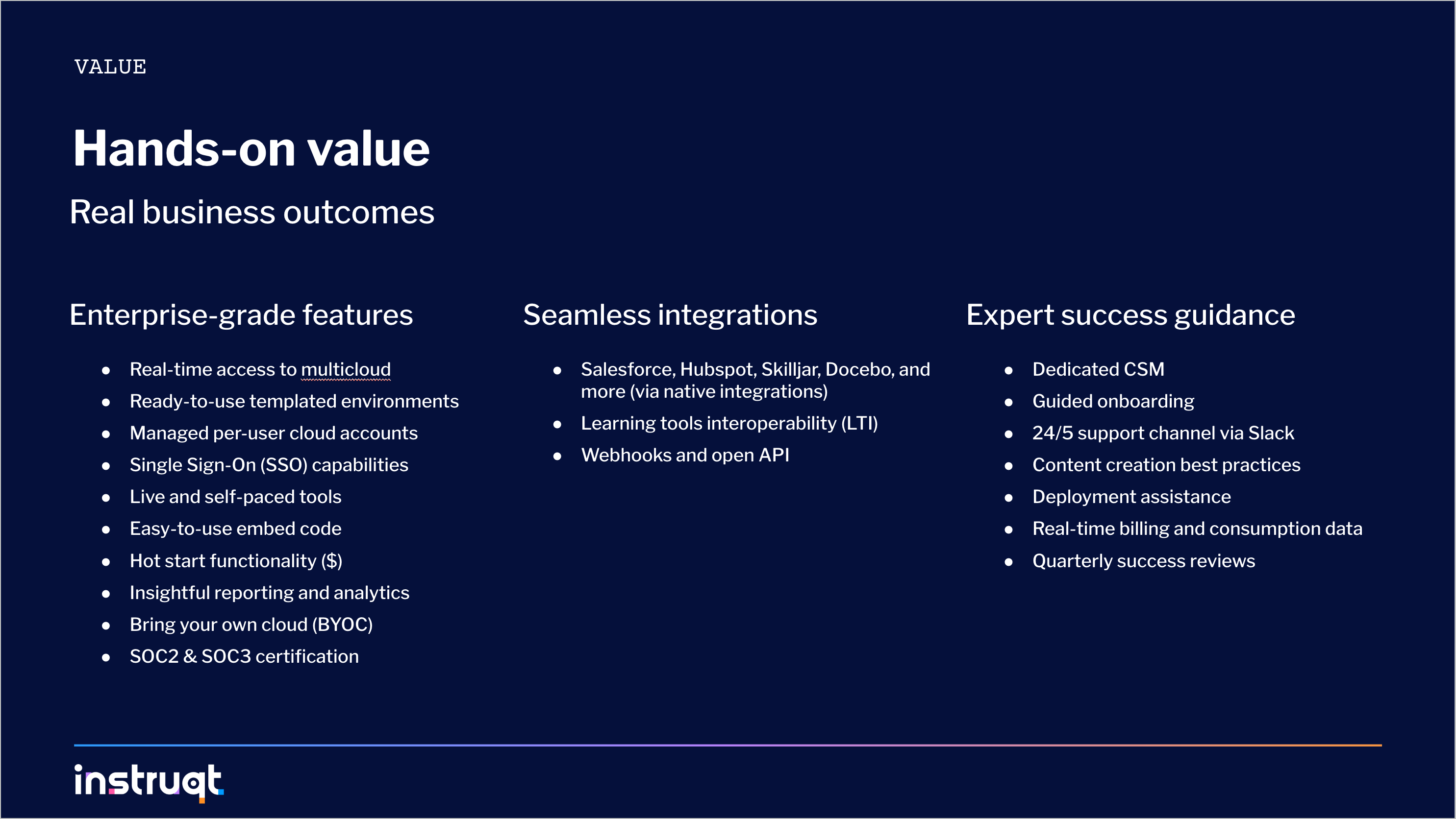Instruqt ist absolut erstaunlich! Mit der Plattform konnten wir in weniger als 10 Werktagen von einer Idee zur Produktion gelangen. Vor Instruqt hatten wir mit anderen Technologien experimentiert, die einige unserer technischen Anforderungen erfüllten, aber nicht die Bedürfnisse unserer Interessenten und Kunden. Obwohl Instruqt nicht perfekt ist, ist es eine der einfachsten Plattformen, um ein geführtes Erlebnis zu starten, ohne Ausnahme. Bewertung gesammelt von und auf G2.com gehostet.