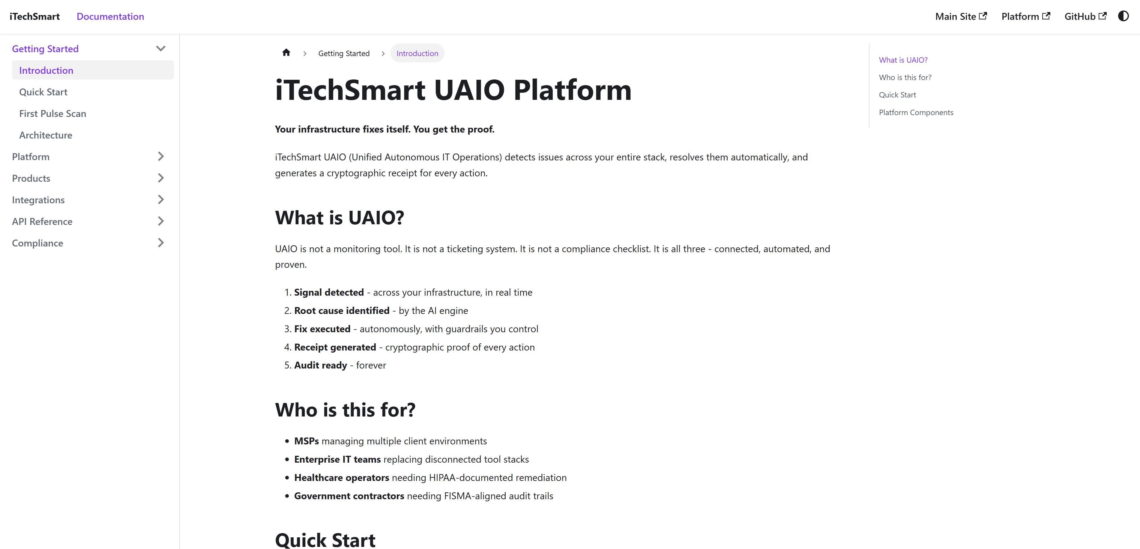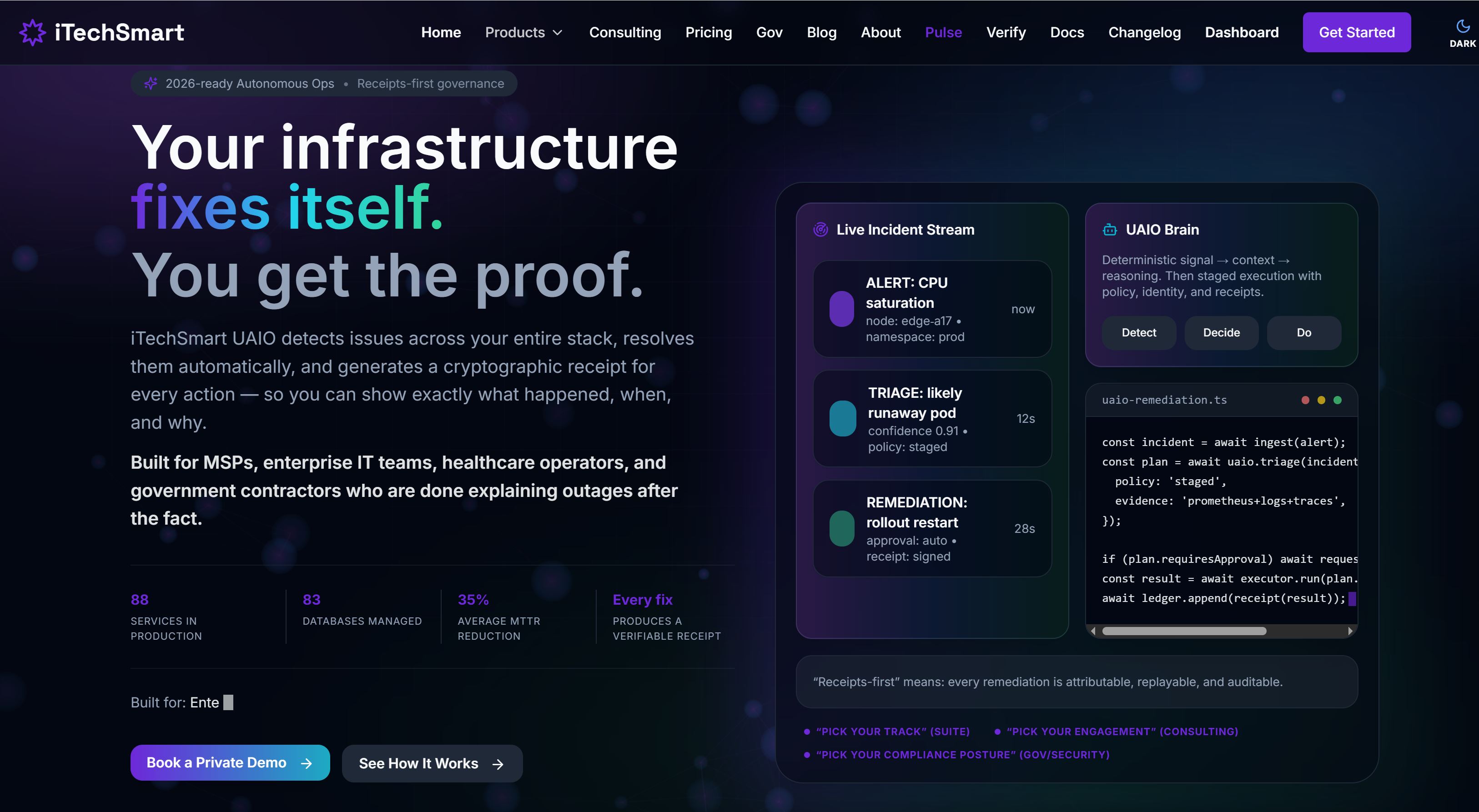 Die meisten IT-Plattformen sagen Ihnen, was kaputt gegangen ist. iTechSmart sagt Ihnen, was kaputt gegangen ist, behebt es und liefert Ihnen einen unterschriebenen Nachweis, dass es passiert ist. Jede Behebung ist mit einem Zeitstempel versehen, manipulationssicher und von jedem öffentlich überprüfbar unter verify.itechsmart.dev – kein Login erforderlich, keine Beteiligung von iTechSmart nötig. Das ist kein Compliance-Feature. Das ist Ihre Audit-Verteidigung, direkt in die Plattform integriert.