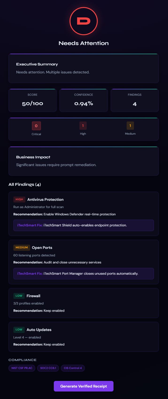 Pulse ist iTechSmarts kostenloser plattformübergreifender Sicherheitsscanner für Windows, macOS und Linux. Er bewertet Ihre Infrastruktur von A bis F in weniger als 60 Sekunden, identifiziert spezifische Sicherheitsbefunde mit verständlichen Erklärungen und erzeugt eine ProofLink-Quittung, die Sie sofort teilen können. Kein Konto erforderlich. Keine Kreditkarte. Einfach herunterladen, ausführen und Ihre Bewertung erhalten.