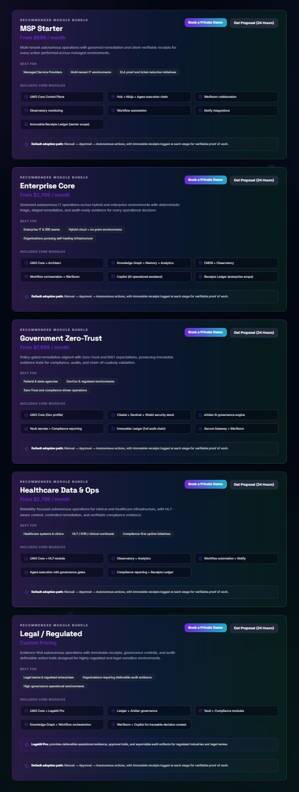 Managed Service Provider, die Multi-Client-Umgebungen in eine einzige autonome Schicht konsolidieren. Unternehmens-IT-Teams, die fragmentierte Tool-Stacks durch eine Plattform ersetzen, die überwacht, behebt und nachweist. Gesundheitssysteme, die HIPAA-konforme Audit-Trails benötigen. Regierungsauftragnehmer, die FISMA-ausgerichtete Dokumentation benötigen, bevor der Prüfer anruft.