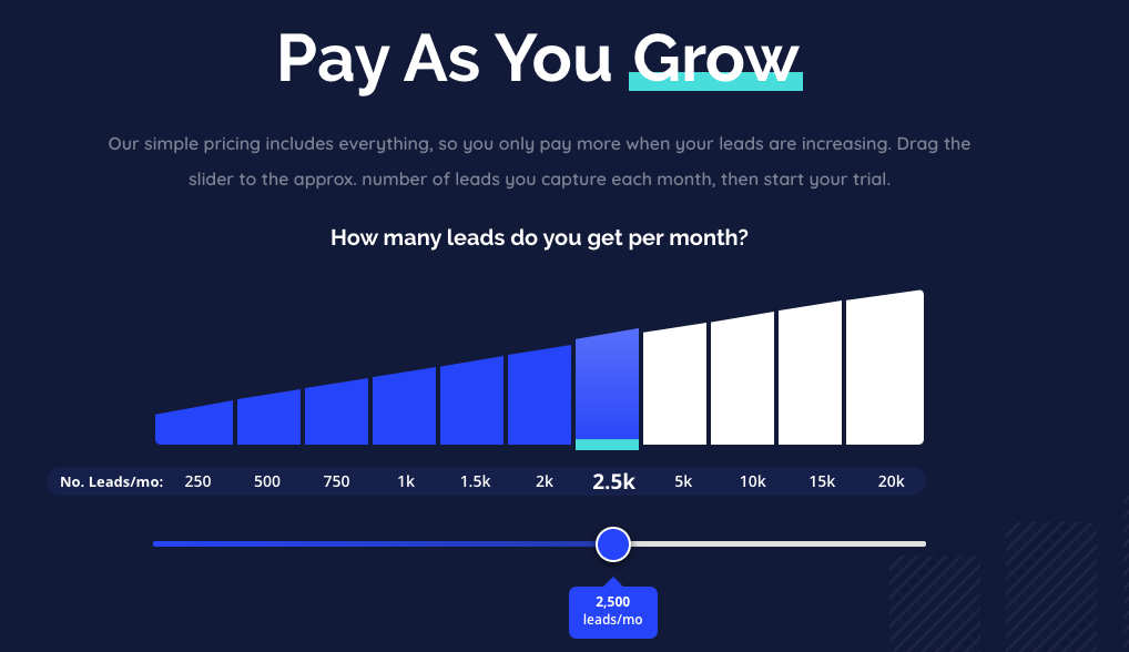 We have over 11 different pricing plans with all features available for all users. Only pay for the leads you need, from as little as 2c per lead.