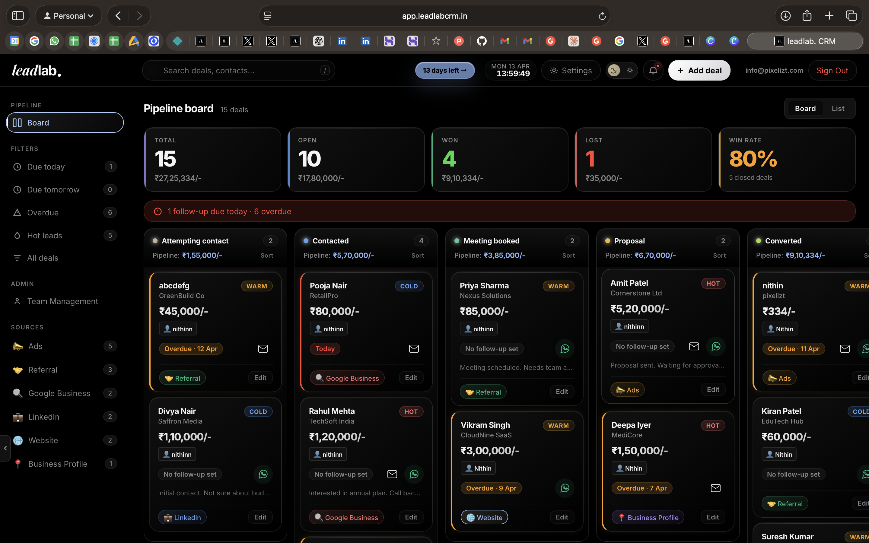Pipedrive ist eine webbasierte Vertriebs-CRM-Software, die Vertriebsteams ermöglicht, Pipelines zu verfolgen, Leads zu optimieren, Geschäfte zu verwalten und ihren gesamten Vertriebsprozess zu automatisieren, sodass sie sich auf den Verkauf konzentrieren können. Die einfache Benutzeroberfläche von Pipedrive befähigt Vertriebsmitarbeiter, Arbeitsabläufe zu optimieren und ihre Vertriebsaufgaben in einem Arbeitsbereich zu vereinen. Und mit KI-gestützten Funktionen, die personalisierte Tipps bieten, war das Gewinnen und Erneuern von Geschäften noch nie einfacher.