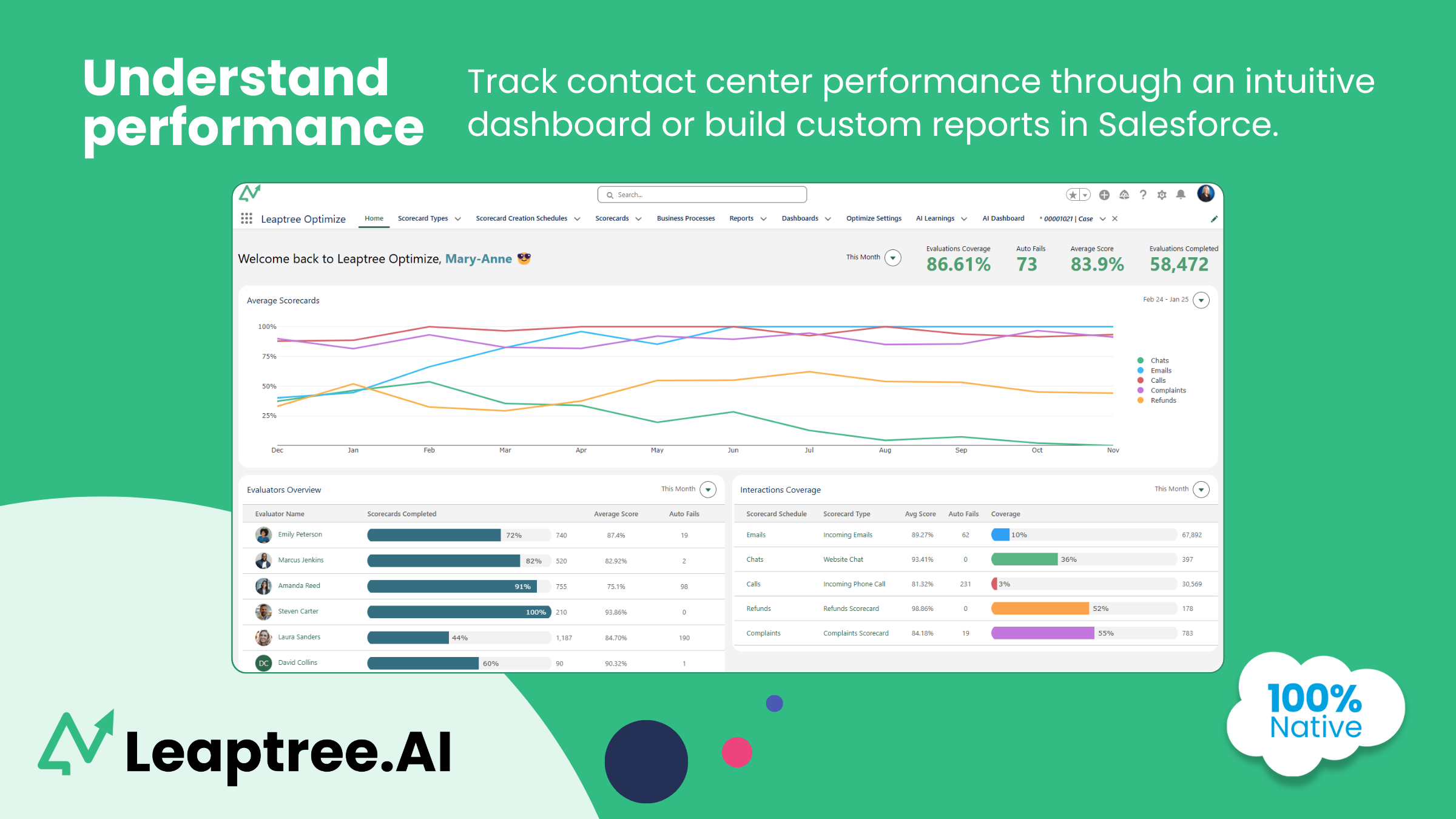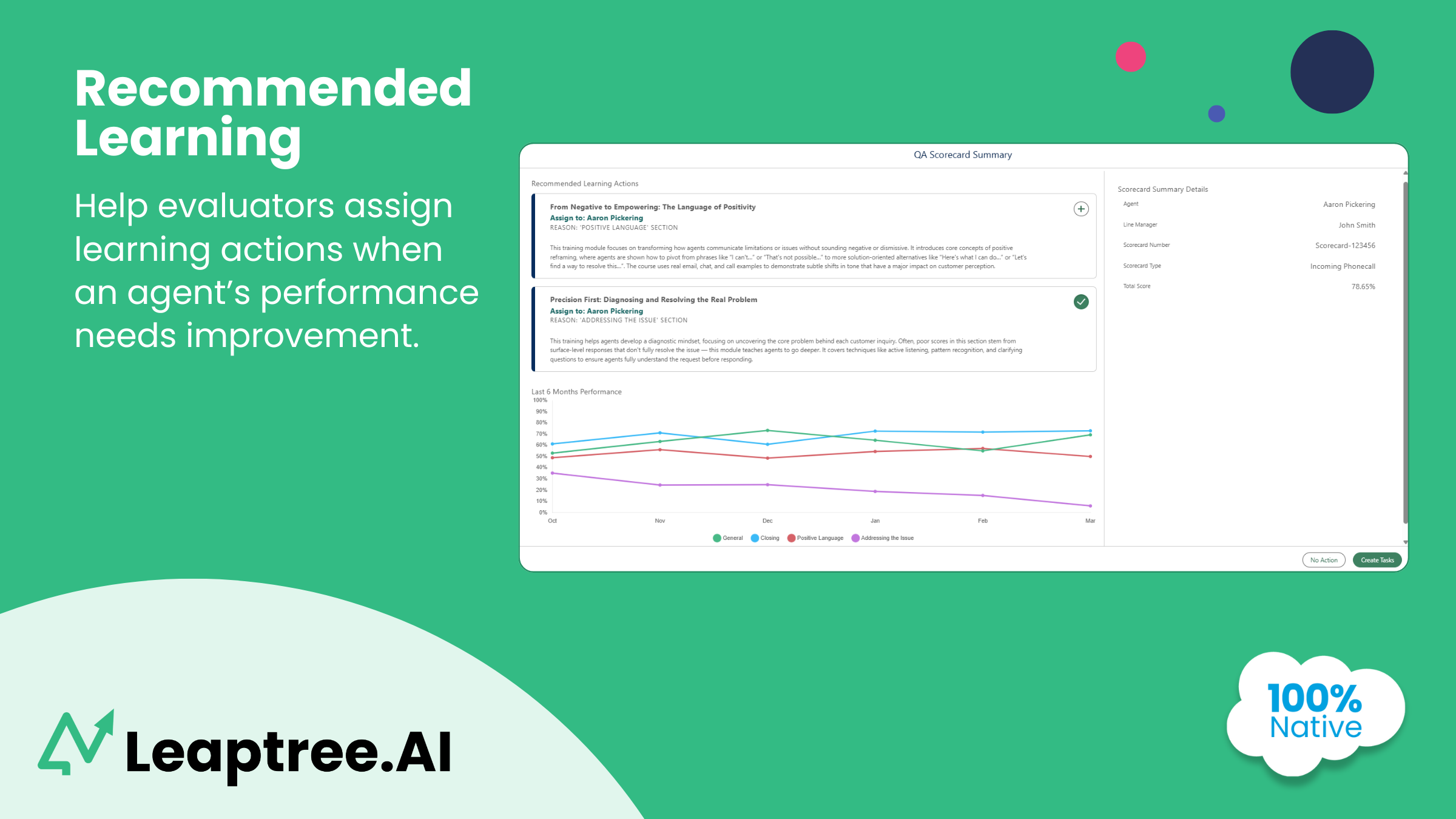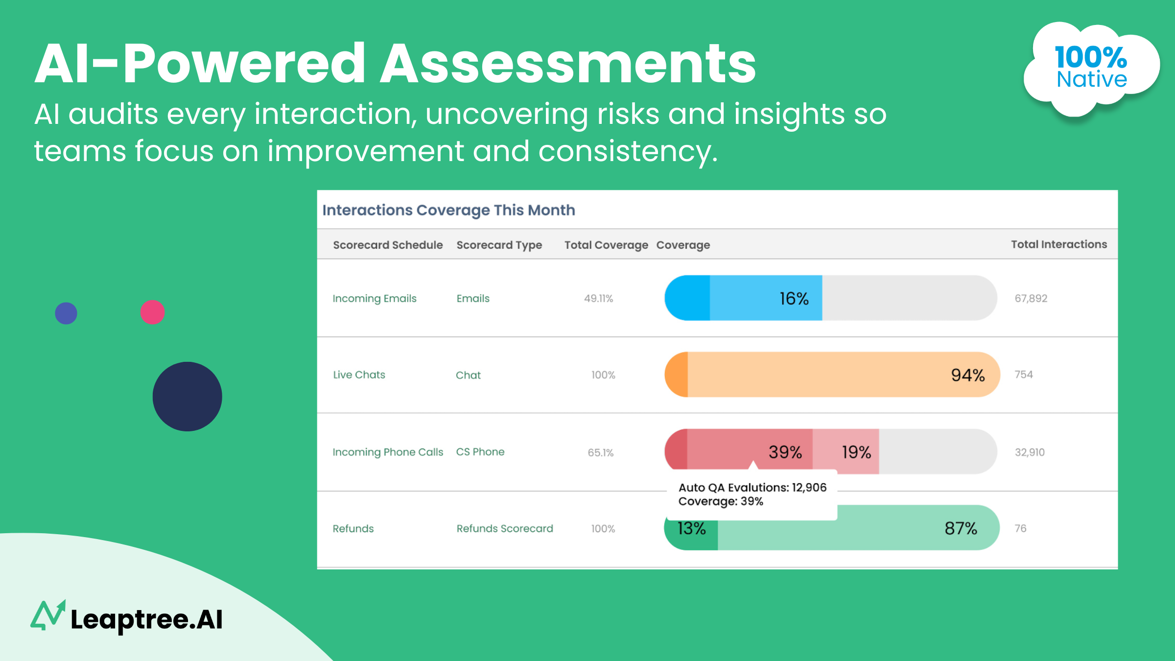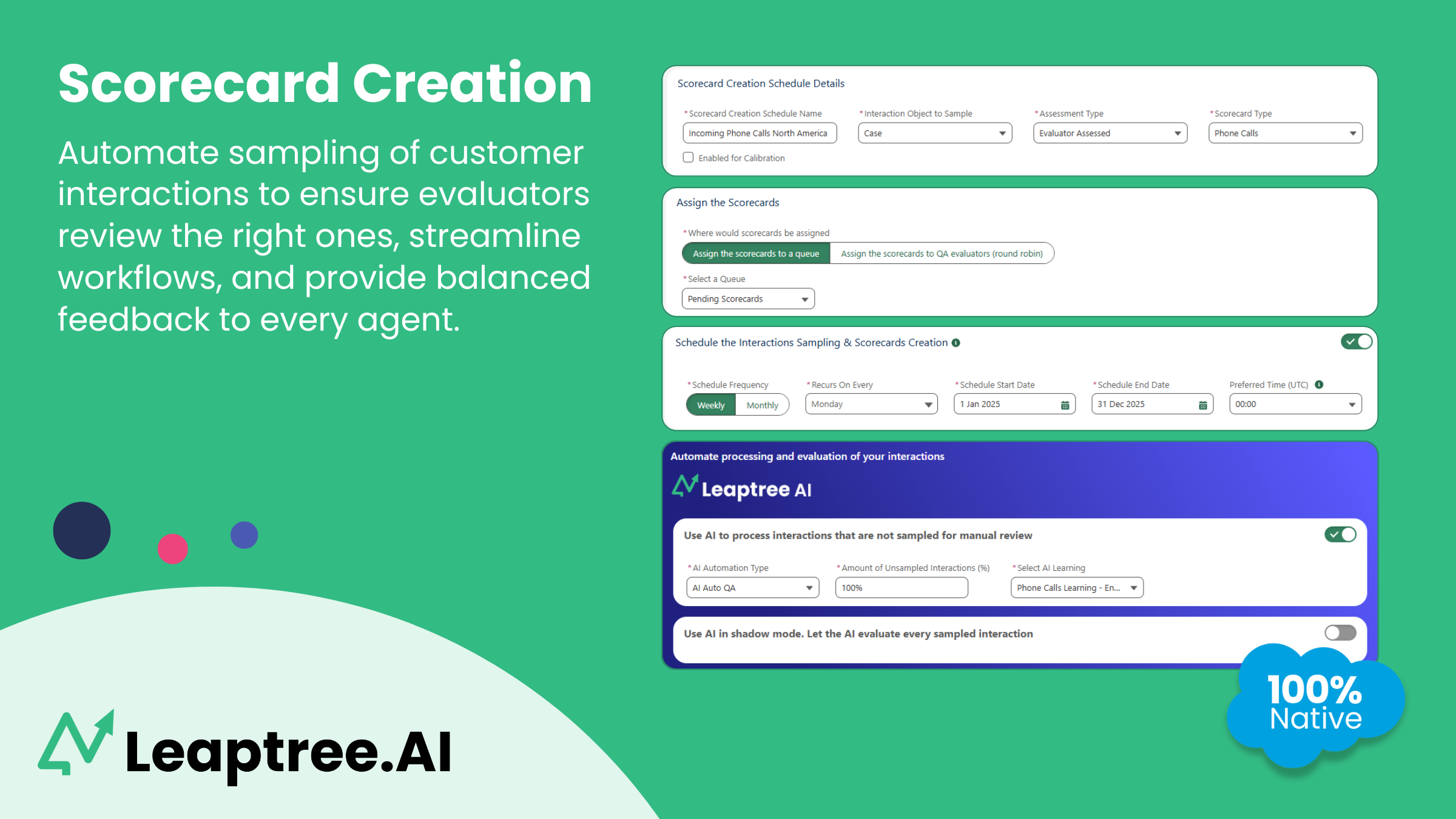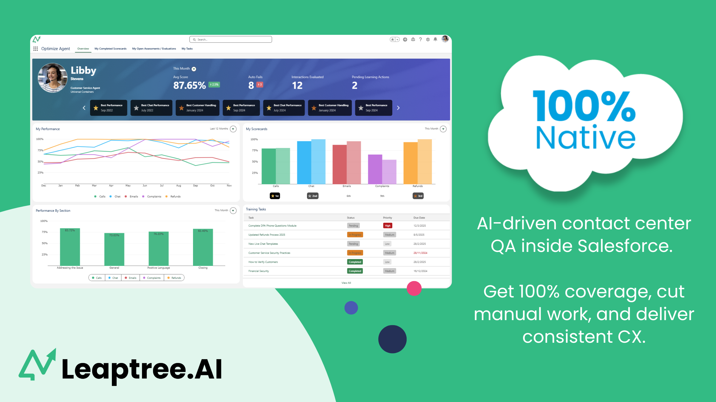 Wir haben LeapTree Optimize Ende letzten Jahres implementiert, und das Ergebnis? Ein erheblicher Anstieg der Konsistenz in allen Aspekten unserer Abläufe und fruchtbarere Coaching-Gespräche. Die Investition in LeapTree Optimize hat sich in greifbaren Einsparungen und verbesserter Produktivität für alle unsere kundenorientierten und Qualitätsevaluierungsteams niedergeschlagen. Ich empfehle das Produkt sehr für Unternehmen, die eine optimierte Salesforce-Integration und verbesserte Leistung suchen. Bewertung gesammelt von und auf G2.com gehostet.