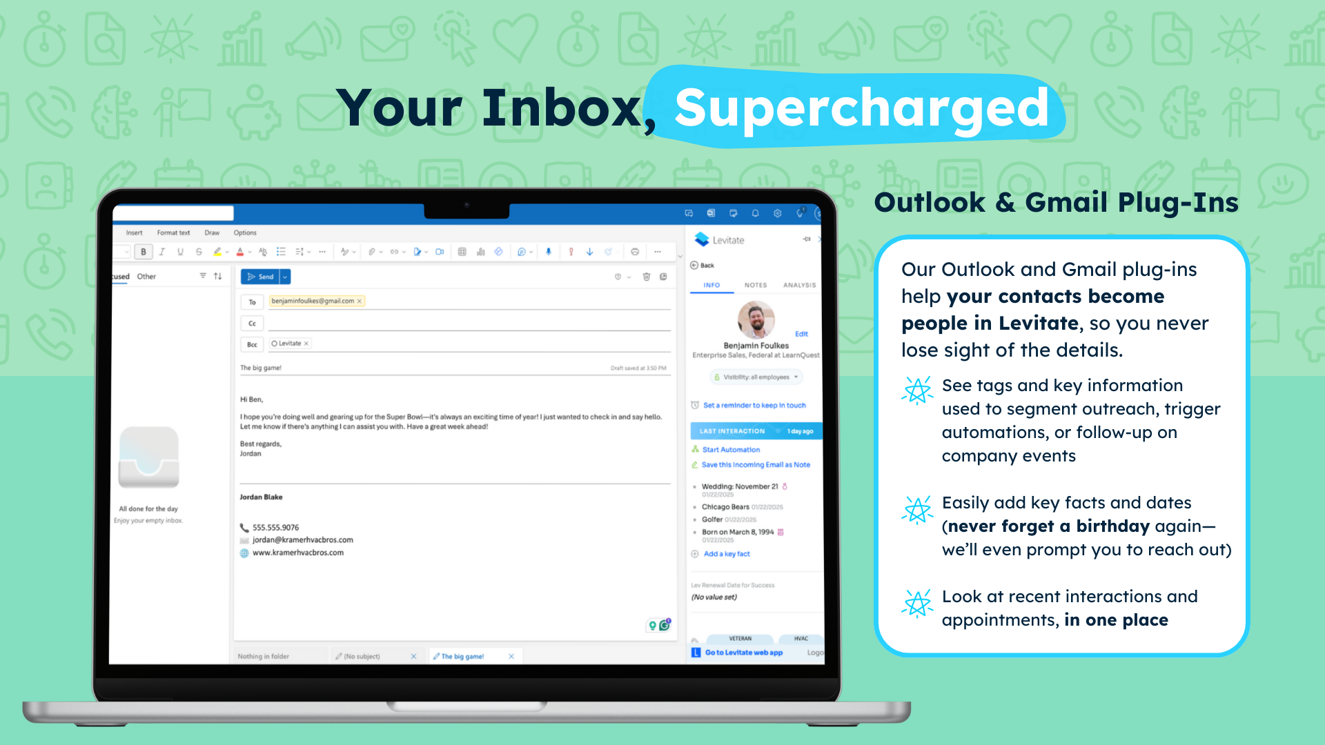 Zu den Hauptmerkmalen von Levitate gehört die Möglichkeit, Umfragen zu versenden, Meetings zu planen und wichtige Details über Kontakte zu merken, was die Qualität der Interaktionen verbessern kann. Zum Beispiel können Benutzer durch das Erinnern an wichtige Fakten wie Geburtstage oder vergangene Gespräche ihre Kommunikation so anpassen, dass sie bei den Kunden tiefer ankommt. Dieser personalisierte Ansatz fördert nicht nur stärkere Beziehungen, sondern hilft Unternehmen auch, ihre Ziele effektiver zu erreichen. Darüber hinaus bietet Levitate die Unterstützung eines engagierten Erfolgsspezialisten/Marketing-Coachs, der den Benutzern Anleitung und Strategien bietet, um ihre Outreach-Bemühungen zu maximieren, ohne dass sie für externe Berater oder andere Marketingfachleute bezahlen müssen.