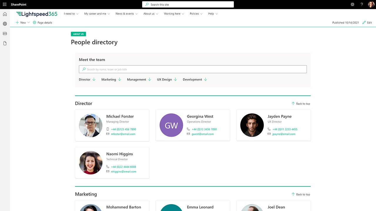 Treten Sie in die Zukunft der Arbeitsplatz-Zusammenarbeit mit Lightspeed365 ein, das von Branchenführern vertraut wird, um Microsoft 365 zu verbessern. Mit Lightspeed365 ist die Einrichtung eines effektiven Intranets einfach und unterstützt direkt die Kommunikation, Zusammenarbeit und die gesamten Geschäftsstrategien Ihres Teams.