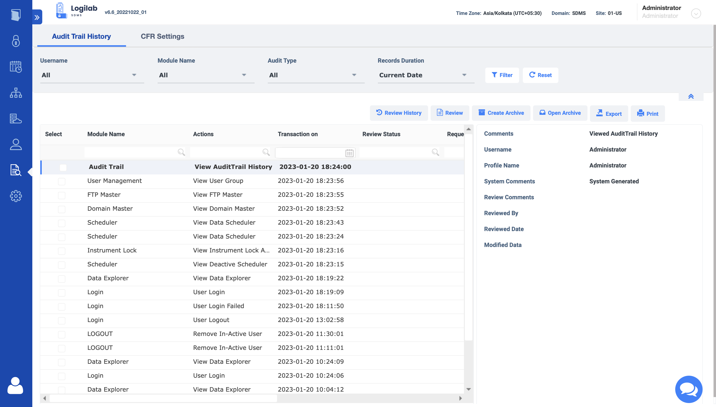 Logilab SDMS ist so konzipiert, dass es Labore bei der Erfüllung von regulatorischen Standards unterstützt, einschließlich 𝟐𝟏 𝐂𝐅𝐑 𝐏𝐚𝐫𝐭 𝟏𝟏, 𝐆𝐋𝐏, 𝐆𝐀𝐌𝐏 𝟓 usw. Es umfasst Funktionen wie elektronische Signaturen, Prüfpfade und rollenbasierte Zugriffskontrolle, um die Audit-Bereitschaft und Datenintegrität zu unterstützen.