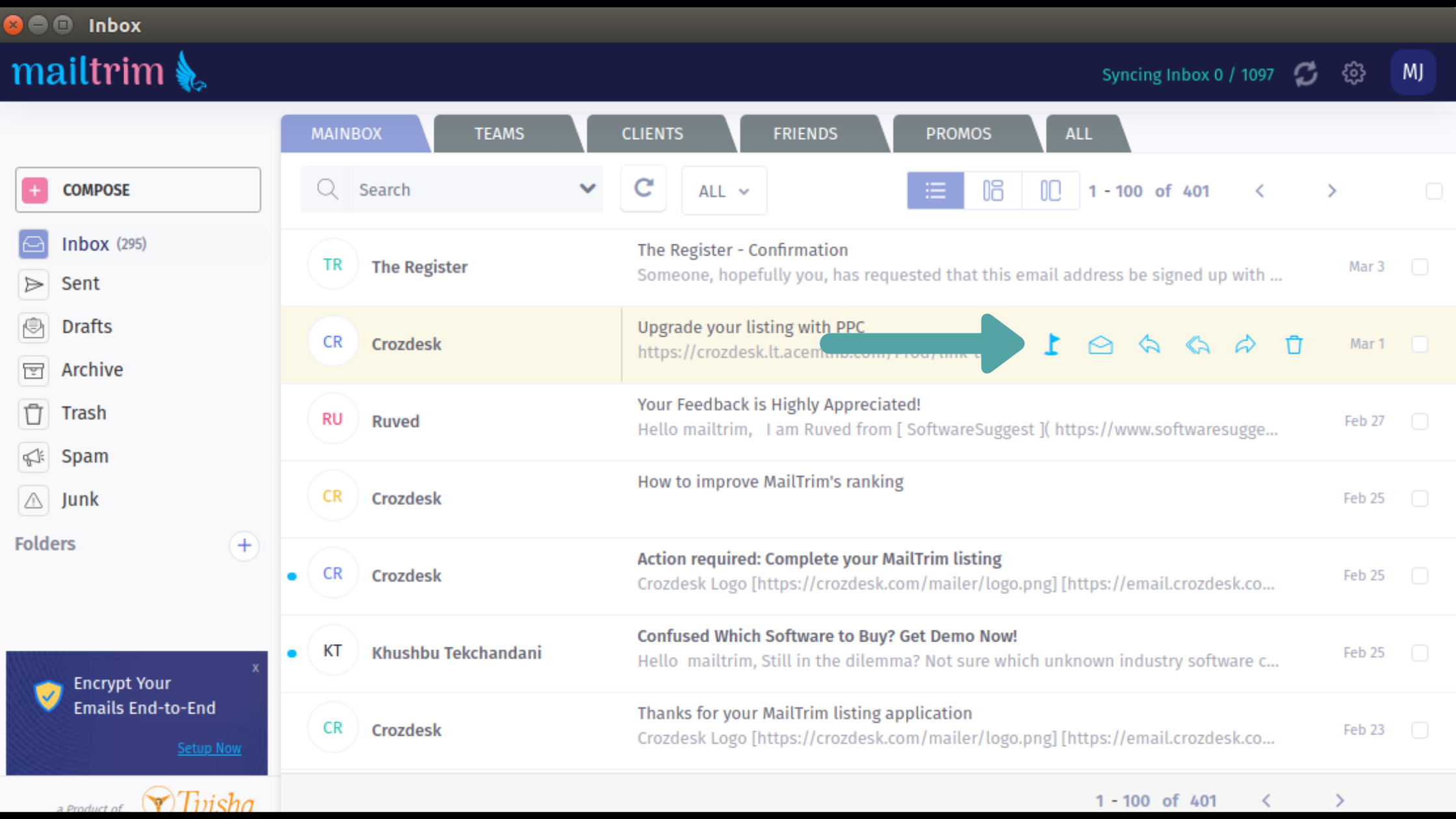 Das Merkmal, das mir an diesem E-Mail-Client am besten gefällt, ist sein übersichtlicher und einheitlicher Posteingang. Wir müssen nicht zwischen mehreren E-Mail-Anbietern wechseln, um E-Mails zu überprüfen. Alle E-Mails können im einheitlichen Posteingang von Mailtrim angezeigt werden. Wir können E-Mails sortieren, kennzeichnen und priorisieren. Außerdem können wir Benachrichtigungen für später zu beantwortende E-Mails einstellen. Es spart viel Zeit! Bewertung gesammelt von und auf G2.com gehostet.
