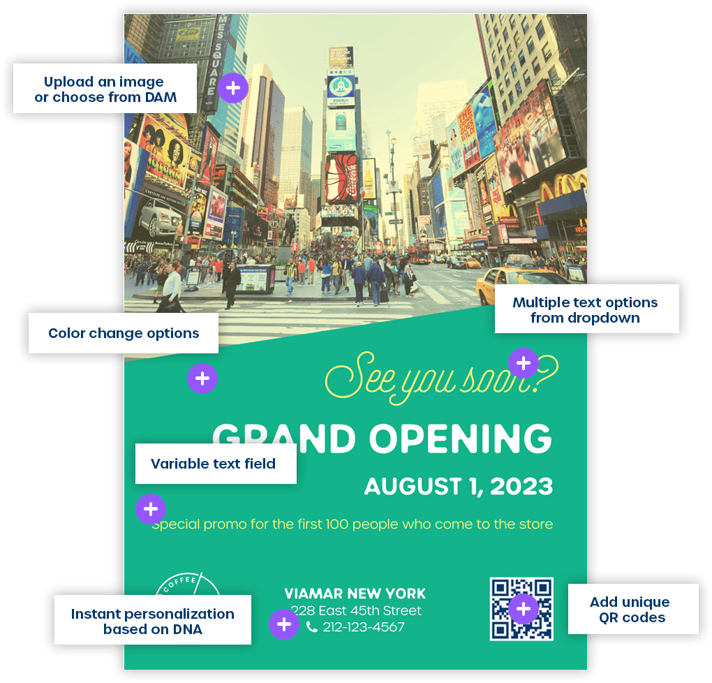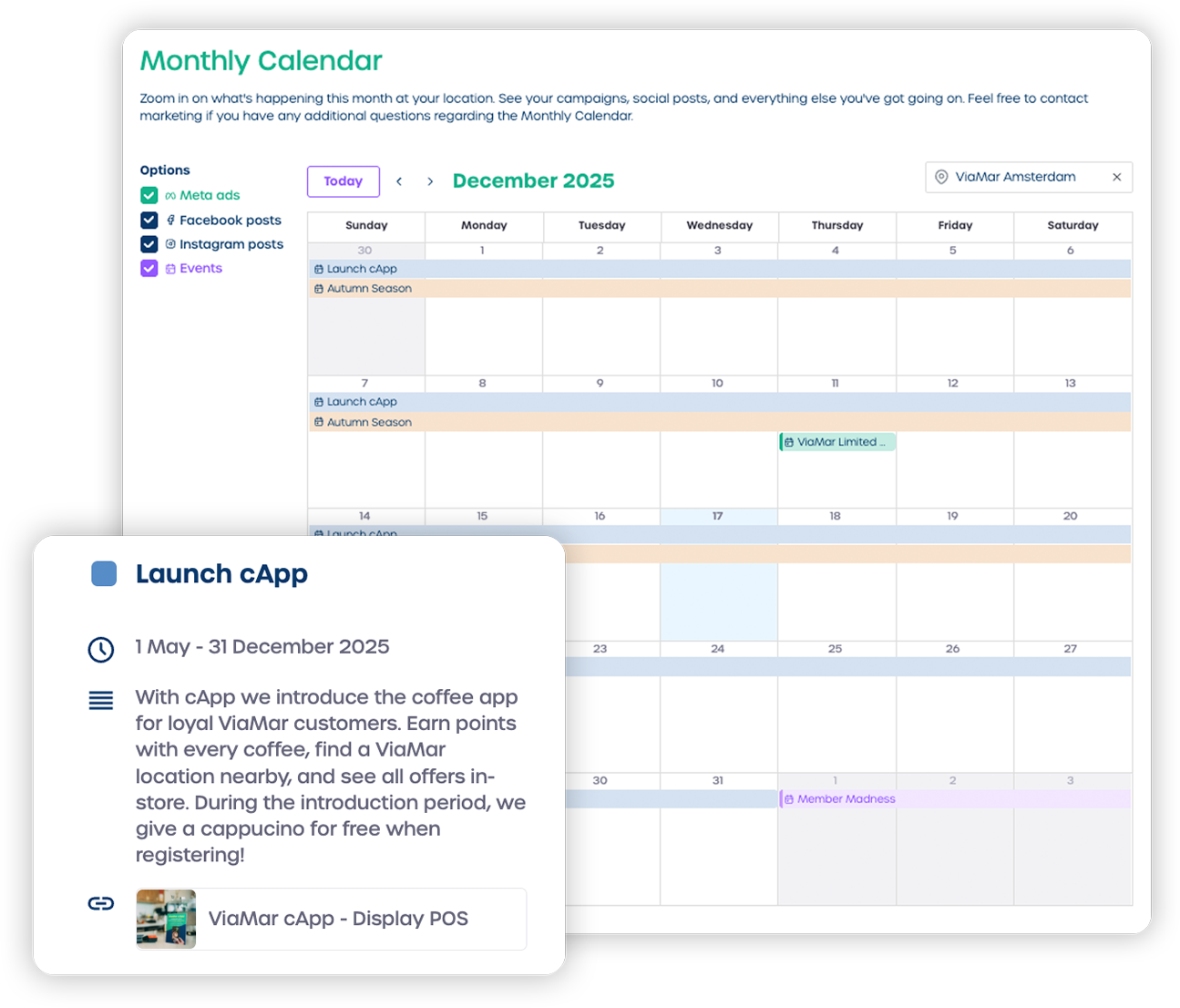 Die Plattform zentralisiert alles, was Franchise-Nehmer benötigen, an einem Ort: markenfreigegebene Vorlagen durch Marvias Dynamic Template System, Digital Asset Management (DAM) für alle Marketingressourcen, integrierte Markenrichtlinien, Marketingkalender für Kampagnenkoordination, Social Campaigns für direkte Postings auf Facebook und Instagram, Meta Ads-Integration für hyperlokale Werbung und einen Marketing-Shop für einheitliche Druckbestellungen. Franchise-Nehmer können Vorlagen mit lokalen Angeboten, Veranstaltungen und Gemeinschaftsverbindungen personalisieren, indem sie Marvia DNA verwenden, das automatisch standortspezifische Daten einfügt, während gesperrte Markenelemente perfekte Konsistenz gewährleisten. Kreative Anforderungs-Workflows verwalten individuelle Bedürfnisse und Genehmigungen. Was früher Wochen des Hin und Her mit der Zentrale dauerte, dauert jetzt Minuten.