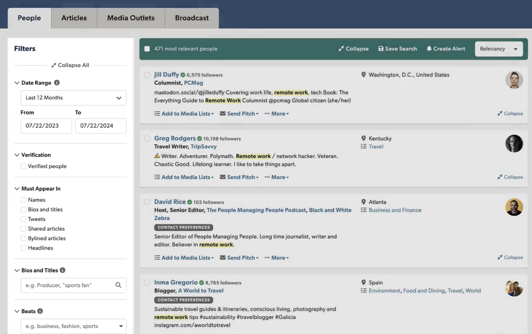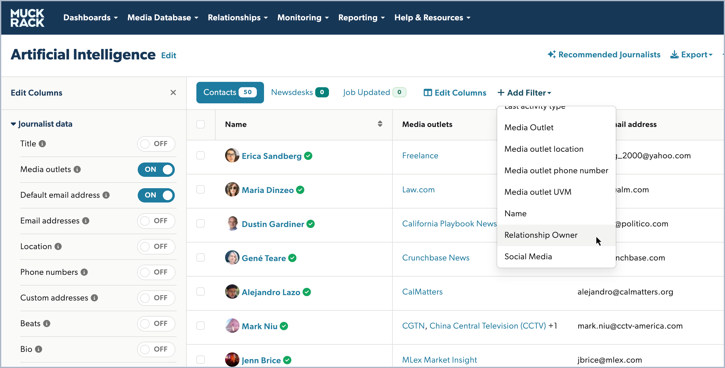 Die Mediendatenbank der Plattform ist die genaueste und aktuellste in der Branche. Durch die Kombination fortschrittlicher Technologie mit einem erfahrenen Redaktionsteam kuratiert Muck Rack Hunderte Millionen von Datenpunkten über Journalisten und Medien in den Bereichen digital, Rundfunk, Print, Podcasts, Newsletter und soziale Medien.