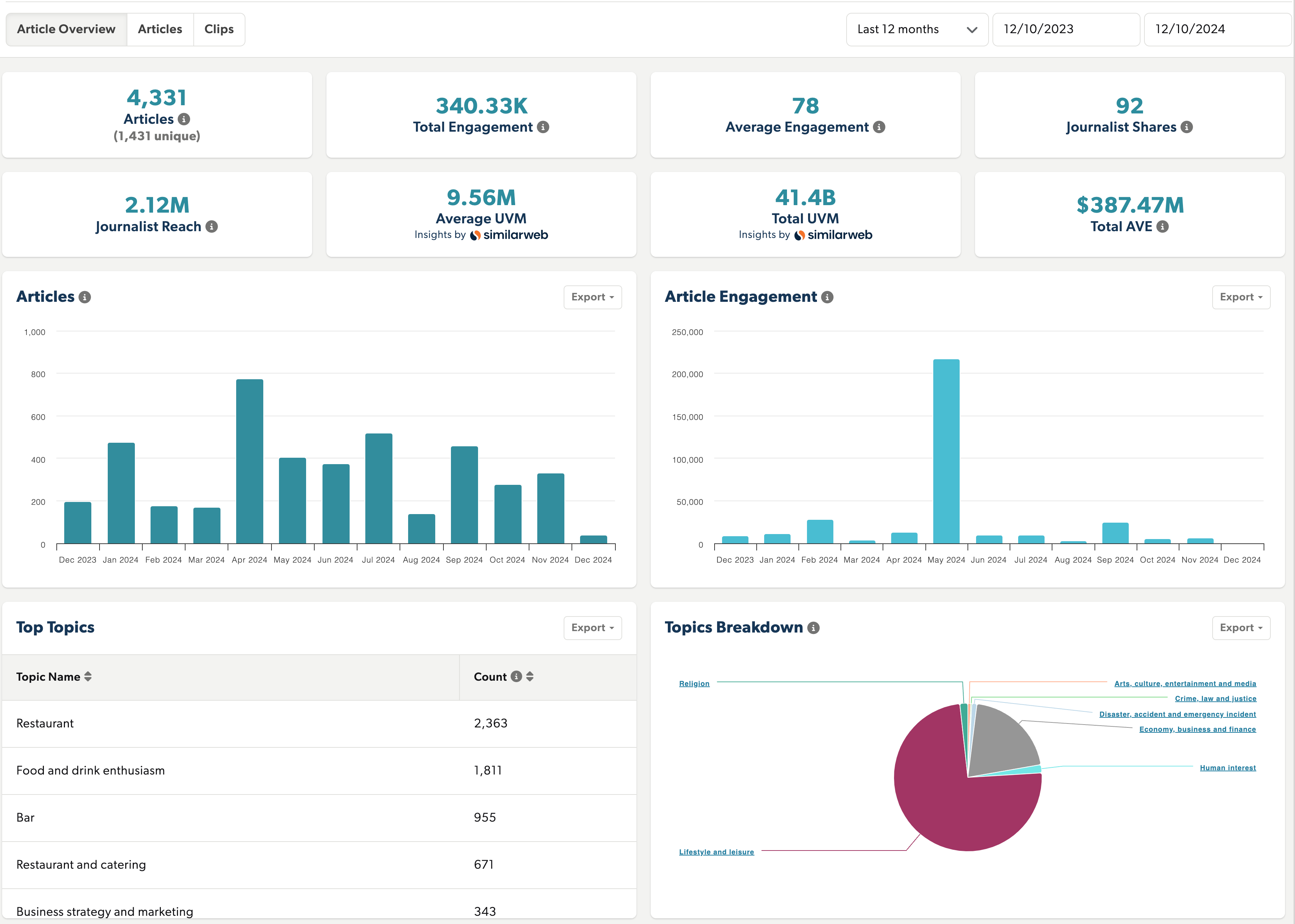 Muck Racks fortschrittliche Analyse- und Berichterstattungstools bieten ergebnisbasierte Vorlagen, um wichtige Bereiche der Medienarbeit zu messen, einschließlich Medienwirkung, Markenreputation, Wettbewerbsanalyse, Journalistenbeziehungen und Outreach-Leistung.