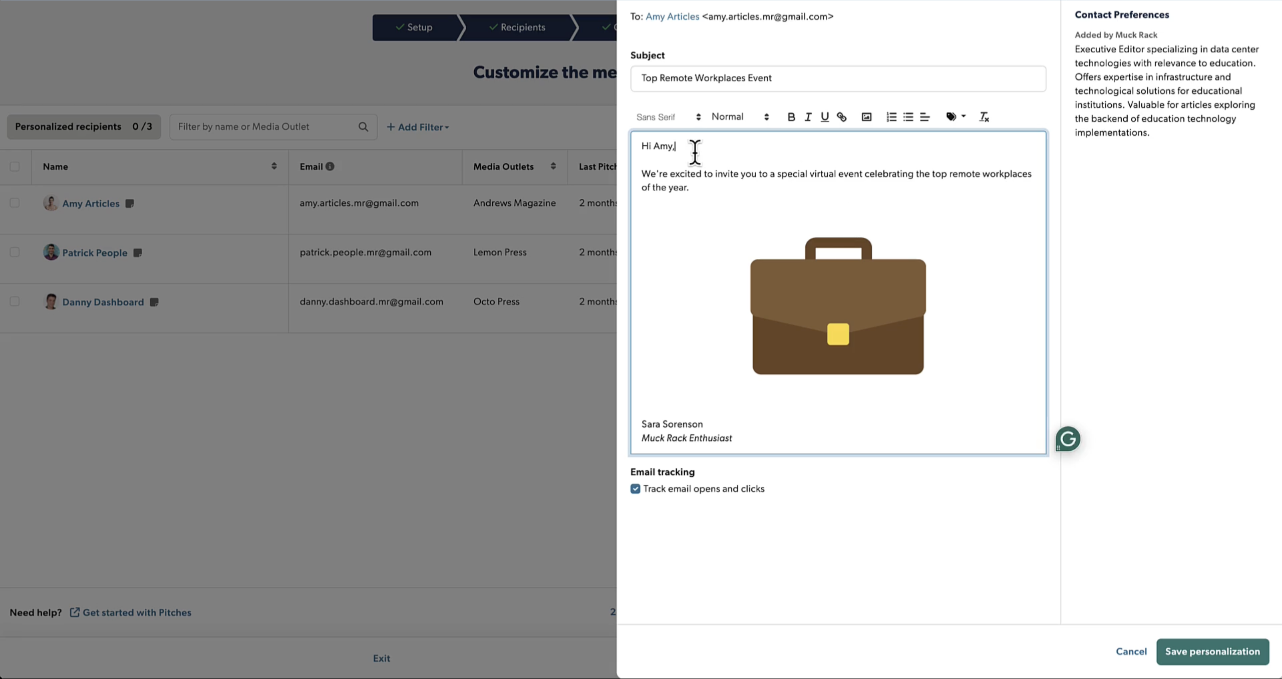 Muck Rack ist ein Tool, das es Benutzern ermöglicht, Geschichten an die Medien zu erzählen, indem sie Journalisten Story-Ideen vorschlagen, Benachrichtigungen erhalten, wenn Journalisten Ihre Marke oder ein Schlüsselwort erwähnen, und die Wirkung von PR-Bemühungen messen. Journalisten verwalten ihre Online-Identität und verfolgen, wie ihre Artikel geteilt werden.